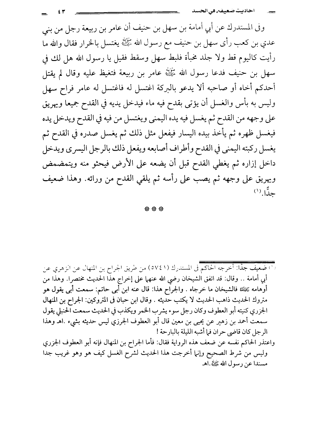 * وفى المستدرك عن أبي أمامة بن سهل بن حنيف أن عامر بن ربيعة رجل من بني عدي بن كعب رأى سهل بن حنيف مع رسول الله صلى الله عليه وسلم يغتسل بالخرار فقال والله ما رأيت كاليوم قط ولا جلد مخبأة فلبط سهل وسقط فقيل يا رسول الله هل لك في سهل بن حنيف فدعا رسول الله صلى الله عليه وسلم عامر بن ربيعة فتغيظ عليه وقال لم يقتل أحدكم أخاه أو صاحبه ألا يدعو بالبركة اغتسل له فاغتسل له عامر فراح سهل وليس به بأس والغسل أن يؤتى بقدح فيه ماء فيدخل يديه في القدح جميعا ويهريق على وجهه من القدح ثم يغسل فيه يده اليمنى ويغتسل من فيه في القدح ويدخل يده فيغسل ظهره ثم يأخذ بيده اليسار فيفعل مثل ذلك ثم يغسل صدره في القدح ثم يغسل ركبته اليمنى في القدح وأطراف أصابعه ويفعل ذلك بالرجل اليسرى ويدخل داخل إزاره ثم يغطي القدح قبل أن يضعه على الأرض فيحثو منه ويتمضمض ويهريق على وجهه ثم يصب على رأسه ثم يلقي القدح من ورائه. وهذا ضعيف جدا. (¬1)