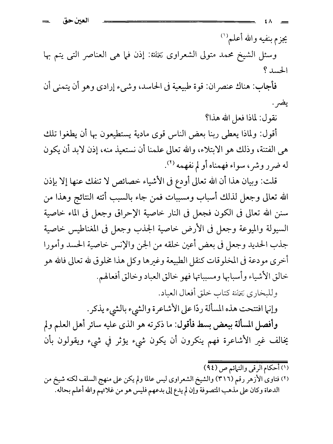 قلت: وبيان هذا أن الله تعالى أودع فى الأشياء خصائص لا تنفك عنها إلا بإذن الله تعالى وجعل لذلك أسباب ومسببات فمن جاء بالسبب أتته النتائج وهذا من سنن الله تعالى فى الكون فجعل فى النار خاصية الإحراق وجعل فى الماء خاصية السيولة والميوعة وجعل فى الأرض خاصية الجذب وجعل فى المغناطيس خاصية جذب الحديد وجعل فى بعض أعين خلقه من الجن والإنس خاصية الحسد وأمورا أخرى مودعة فى المخلوقات كنقل الطبيعة وغيرها وكل هذا مخلوق لله تعالى فالله هو خالق الأشياء وأسبابها ومسبباتها فهو خالق العباد وخالق أفعالهم. وللبخارى رحمه الله كتاب خلق أفعال العباد وإنما افتتحت هذه المسألة ردا على الأشاعرة والشئ بالشئ يذكر.