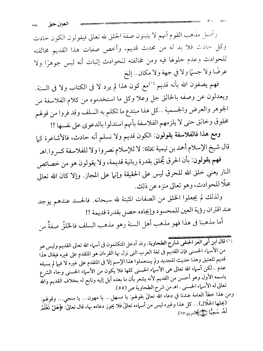 فهم يصفون الله بأنه قديم (¬1) مع كون هذا لم يرد لا فى الكتاب ولا فى السنة. ويعدلون عن وصفه بالخالق جل وعلا وكل ما استخدموه من كلام الفلاسفة من الجوهر والعرض والجسمية .. كل هذا مبتدع ما تكلم به السلف وقد فروا من قولهم مخلوق وخالق حتى لا يلزمهم الفلاسفة بأنهم استدلوا بالدعوى على نفسها! ! ومع هذا فالفلاسفة يقولون: الكون قديم ولا نسلم أنه حادث، فالأشاعرة كما قال شيخ الإسلام أحمد بن تيمية رحمه الله: لا للإسلام نصروا ولا للفلاسفة كسروا. اهـ فهم يقولون بأن الحرق يُخلق بقدرة ربانية قديمة. ولا يقولون هو من خصائص النار يعني خلق الله للحرق ليس على الحقيقة وإنما على المجاز. وإلا كان الله تعالى محلاً للحوادث، وهو تعالى منزه عن ذلك. ولذلك لم يجعلوا الخلق من الصفات المثبتة لله سبحانه.