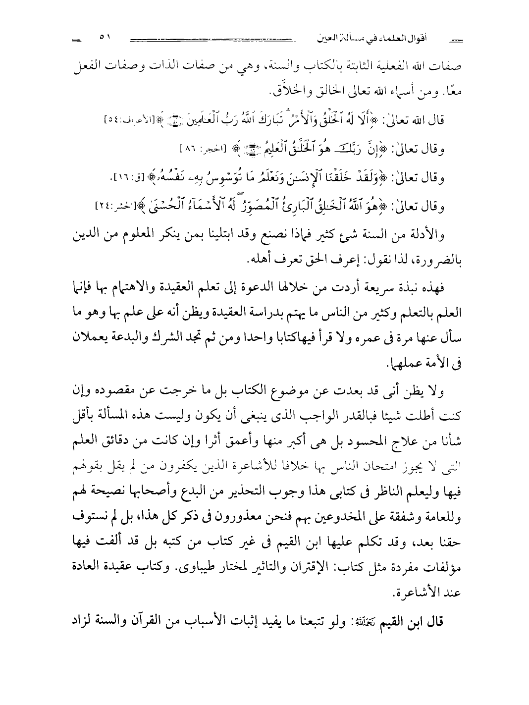 ولا يظن أنى قد بعدت عن موضوع الكتاب بل ما خرجت عن مقصوده وإن كنت أطلت شيئا فبالقدر الواجب الذى ينبغى أن يكون وليست هذه المسألة بأقل شأنا من علاج المحسود بل هى أكبر منها وأعمق أثرا وإن كانت من دقائق العلم التى لا يجوز امتحان الناس بها خلافا للأشاعرة الذين يكفرون من لم يقل بقولهم فيها وليعلم الناظر فى كتابى هذا وجوب التحذير من البدع وأصحابها نصيحة لهم وللعامة وشفقة على المخدوعين بهم فنحن معذورون فى ذكر كل هذا ذلك بل لم نستوف حقنا بعد. وقد تكلم عليها ابن القيم فى غير كتاب من كتبه بل قد ألفت فيها مؤلفات مفردة مثل كتاب: الإقتران والتاثير لمختار طيباوى. وكتاب عقيدة العادة عند الأشاعرة.