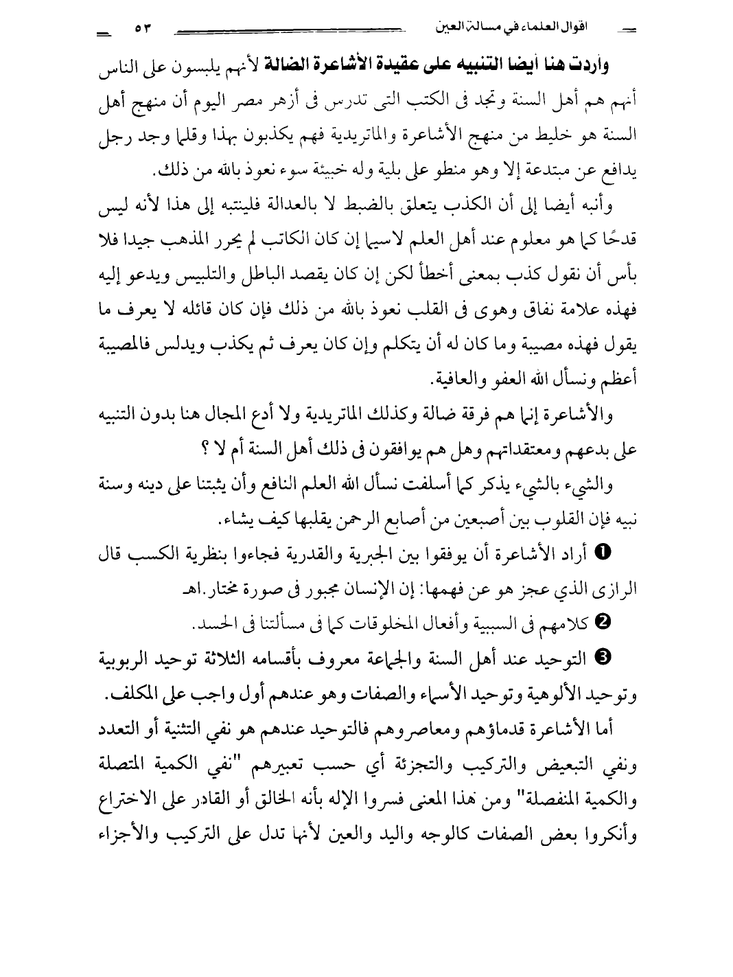 وأردت هنا أيضا التنبيه على عقيدة الأشاعرة الضالة لأنهم يلبسون على الناس أنهم هم أهل السنة وتجد فى الكتب التى تدرس فى أزهر مصر اليوم أن منهج أهل السنة هو خليط من منهج الأشاعرة والماتريدية فهم يكذبون بهذا وقلما وجد رجل يدافع عن مبتدعة إلا وهو منطو على بلية وله خبيئة سوء نعوذ بالله من ذلك. وأنبه أيضا إلى أن الكذب يتعلق بالضبط لا بالعدالة فلينتبه إلى هذا لأنه ليس قدحا كما هو معلوم عند أهل العلم لاسيما إن كان الكاتب لم يحرر المذهب جيدا فلا بأس أن نقول كذب بمعنى أخطأ لكن إن كان يقصد الباطل والتلبيس ويدعو إليه فهذه علامة نفاق وهوى فى القلب نعوذ بالله من ذلك فإن كان قائله لا يعرف ما يقول فهذه مصيبة وما كان له أن يتكلم وإن كان يعرف ثم يكذب ويدلس فالمصيبة أعظم ونسأل الله العفو والعافية. والأشاعرة إنما هم فرقة ضالة وكذلك الماتريدية ولا أدع المجال هنا بدون التنبيه على بدعهم ومعتقداتهم وهل هم يوافقون فى ذلك أهل السنة أم لا؟ والشئ بالشئ يذكر كما أسلفت نسأل الله العلم النافع وأن يثبتنا على دينه وسنة نبيه فإن القلوب بين أصبعين من أصابع الرحمن يقلبها كيف يشاء.