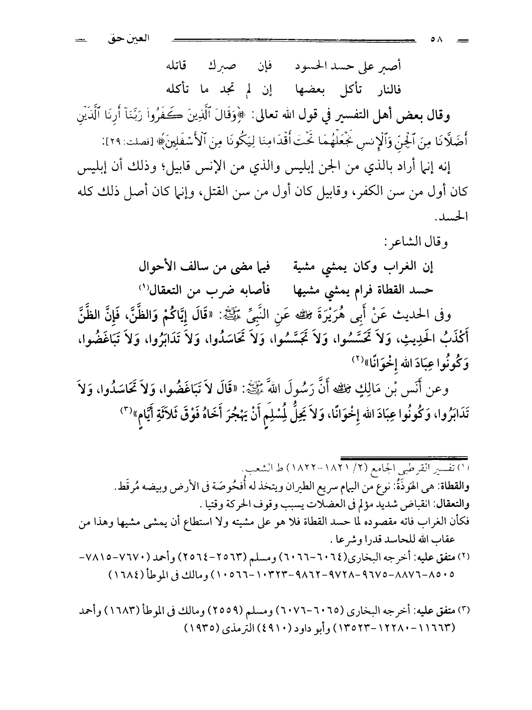 (¬1) تفسير القرطبى الجامع (2/ 1821 - 1822) ط الشعب. والقطاة هى الهَوذَةُ: نوع من اليمام سريع الطيران ويتخذ له أُفحُوصَة فى الأرض وبيضه مُرقّط. والتعقال: انقباض شديد مؤلم فى العضلات يسبب وقوف الحركة وقتيا. فكأن الغراب فاته مقصوده لما حسد القطاة فلا هو على مشيته ولا استطاع أن يمشى مشيها وهذا من عقاب الله للحاسد قدرا وشرعا.