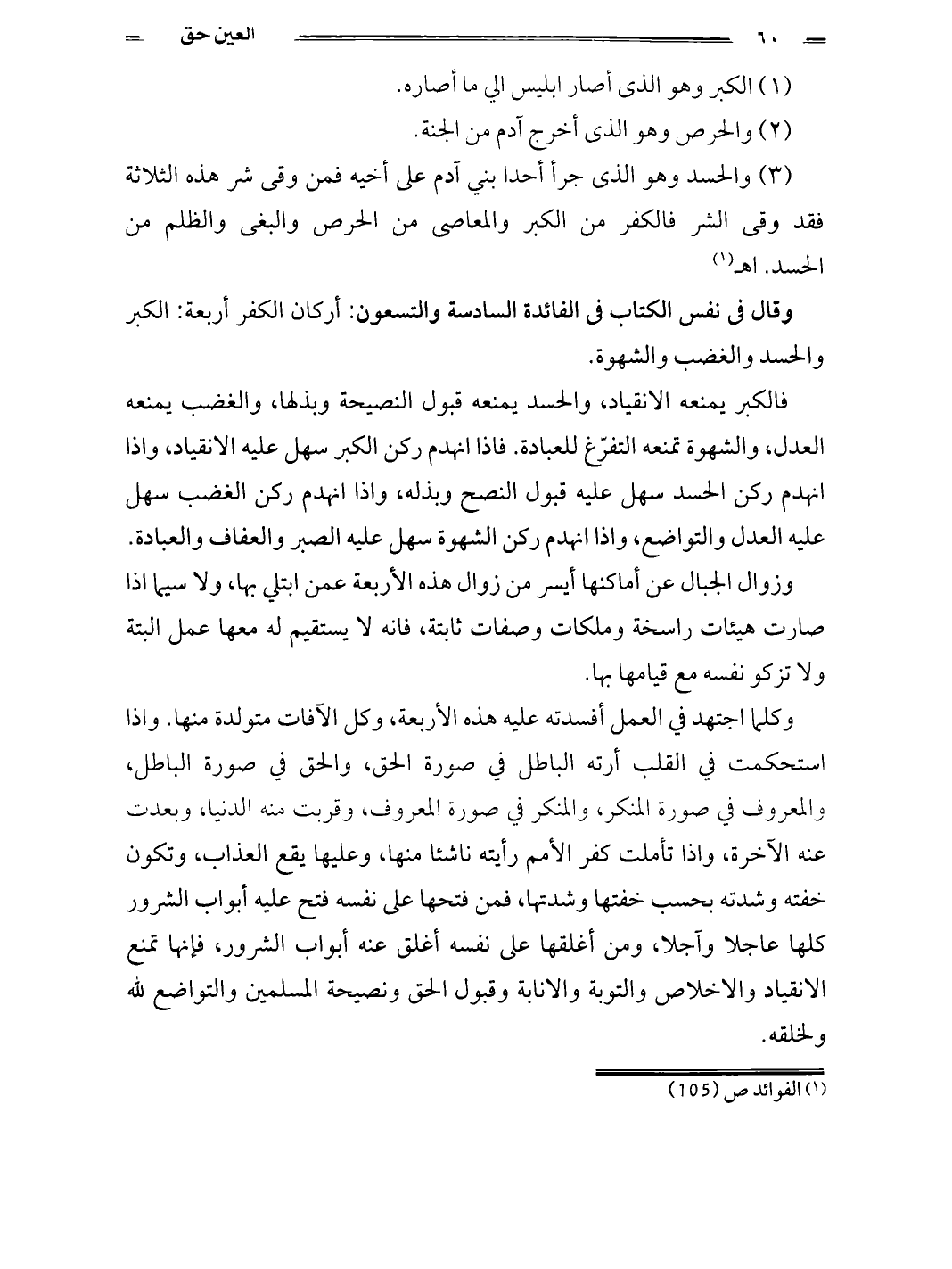 وقال فى نفس الكتاب فى الفائدة السادسة والتسعون: أركان الكفر أربعة: الكبر والحسد والغضب والشهوة.