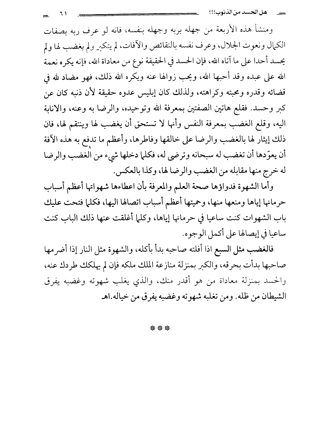 ومنشأ هذه الأربعة من جهله بربه وجهله بنفسه, فانه لو عرف ربه بصفات الكمال ونعوت الجلال, وعرف نفسه بالنقائص والآفات, لم يتكبر ولم يغضب لها ولم يحسد أحدا على ما أتاه الله, فانه الحسد في الحقيقة نوع من معاداة الله, فانه يكره نعمة الله على عبده وقد أحبها الله, ويحب زوالها عنه ويكره الله ذلك. فهو مضاد لله في قضائه وقدره ومحبته وكراهته, ولذلك كان ابليس عدوه حقيقة لأن ذنبه كان عن كبر وحسد. فقلع هاتين الصفتين بمعرفة الله وتوحيده, والرضا به وعنه, والانابة اليه, وقلع الغضب بمعرفة النفس وأنها لا تستحق أن يغضب لها وينتقم لها, فان ذلك ايثار لها بالغضب والرضا على خالقها وفاطرها, وأعظم ما تدفع به هذه الآفة أن يعوّدها أن تغضب له سبحانه وترضى له, فكلما دخلها شيء من الغضب والرضا له خرج منها مقابله من الغضب والرضا لها, وكذا بالعكس.