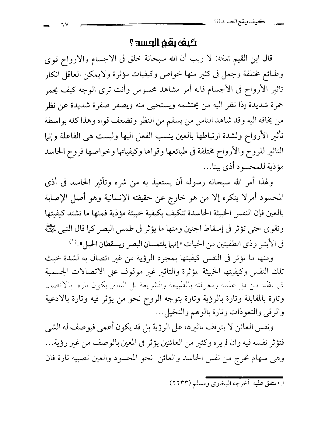 ومنها ماتؤثر فى النفس كيفيتهابمجرد الرؤية من غير اتصال به لشدة خبث تلك النفس وكيفيتها الخبيثة المؤثرة والتاثير غير موقوف على الاتصالات الجسمية كما يظنه من قل علمه ومعرفته بالطبيعة والشريعة بل التاثير يكون تارة ... بالاتصال وتارة بالمقابلة وتارة بالرؤية وتارة بتوجه الروح نحو من يؤثر فيه وتارة بالادعية والرقى والتعوذات وتارة بالوهم والتخيل ... ونفس العائن لايتوقف تاثيرها على الرؤية بل قد يكون اعمى فيوصف له الشى فتؤثر نفسه فيه وان لم يره وكثير من العائنين يؤثر فى المعين بالوصف من غير رؤية ... وهى سهام تخرج من نفس الحاسد والعائن ... نحو المحسود والعين تصبيه تارة فان