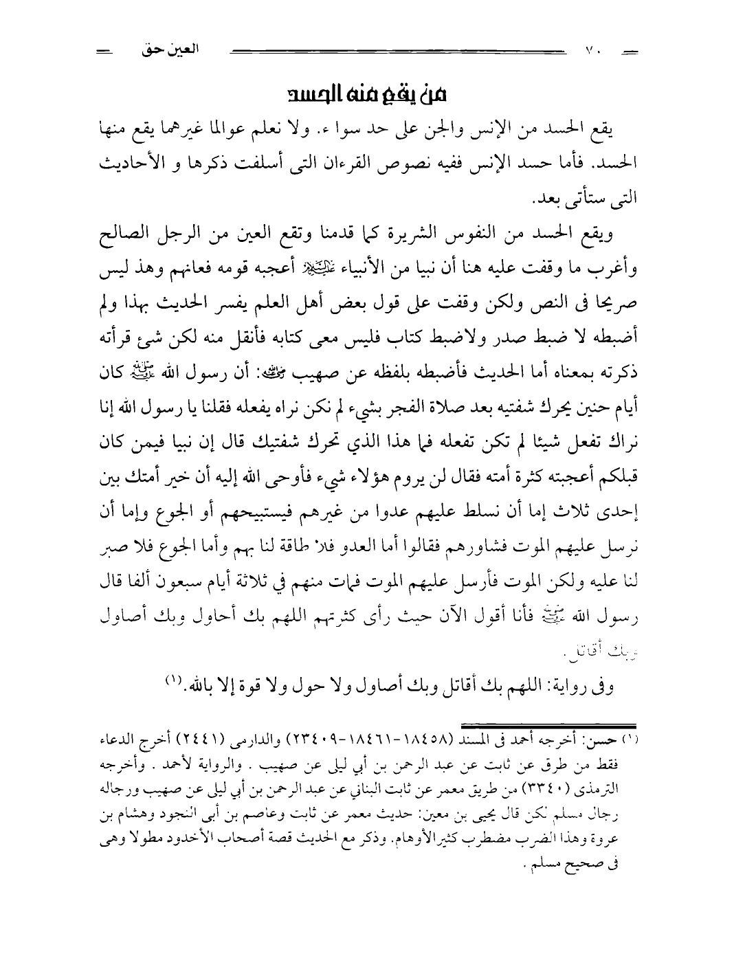 يقع الحسد من الإنس والجن على حد سواء. ولا نعلم عوالما غيرهما يقع منها الحسد. فأما حسد الإنس ففيه نصوص القرءان التى أسلفت ذكرها والأحاديث التى ستأتى بعد. ويقع الحسد من النفوس الشريرة كما قدمنا وتقع العين من الرجل الصالح وأغرب ما وقفت عليه هنا أن نبيا من الأنبياء عليه السلام أعجبه قومه فعانهم وهذ ليس صريحا فى النص ولكن وقفت على قول بعض أهل العلم يفسر الحديث بهذا ولم أضبطه لا ضبط صدر ولاضبط كتاب فليس معى كتابه فأنقل منه لكن شئ قرأته ذكرته بمعناه أما الحديث فأضبطه بلفظه عن صهيب رضى الله عنه: أن رسول الله صلى الله عليه وسلم كان أيام حنين يحرك شفتيه بعد صلاة الفجر بشيء لم نكن نراه يفعله فقلنا يا رسول الله إنا نراك تفعل شيئا لم تكن تفعله فما هذا الذي تحرك شفتيك قال إن نبيا فيمن كان قبلكم أعجبته كثرة أمته فقال لن يروم هؤلاء شيء فأوحى الله إليه أن خير أمتك بين إحدى ثلاث إما أن نسلط عليهم عدوا من غيرهم فيستبيحهم أو الجوع وإما أن نرسل عليهم الموت فشاورهم فقالوا أما العدو فلا طاقة لنا بهم وأما الجوع فلا صبر لنا عليه ولكن الموت فأرسل عليهم الموت فمات منهم في ثلاثة أيام سبعون ألفا قال رسول الله صلى الله عليه وسلم فأنا أقول الآن حيث رأى كثرتهم اللهم بك أحاول وبك أصاول وبك أقاتل. وفى رواية: اللهم بك أقاتل وبك أصاول ولا حول ولا قوة إلا بالله. (¬1)