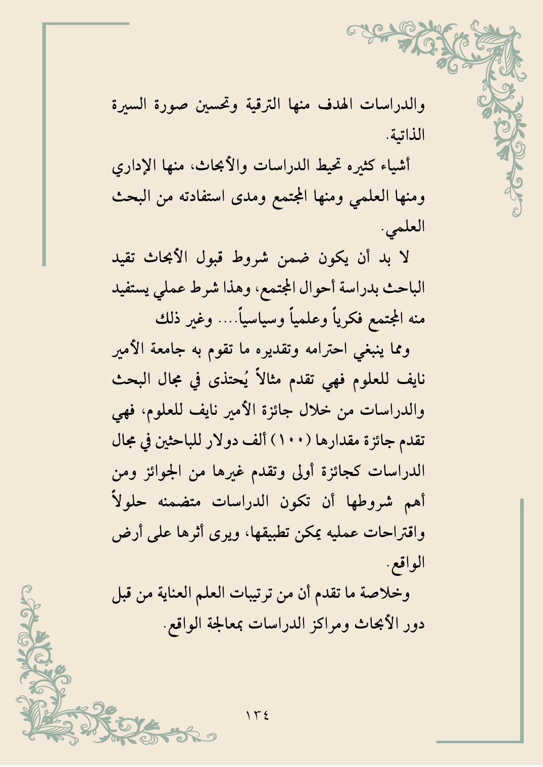 ومما ينبغي احترامه وتقديره ما تقوم به جامعة الأمير نايف للعلوم فهي تقدم مثالاً يُحتذى في مجال البحث والدراسات من خلال جائزة الأمير نايف للعلوم، فهي تقدم جائزة مقدارها (١٠٠) ألف دولار للباحثين في مجال الدراسات كجائزة أولى وتقدم غيرها من الجوائز ومن أهم شروطها أن تكون الدراسات متضمنه حلولاً واقتراحات عمليه يمكن تطبيقها، ويرى أثرها على أرض الواقع.