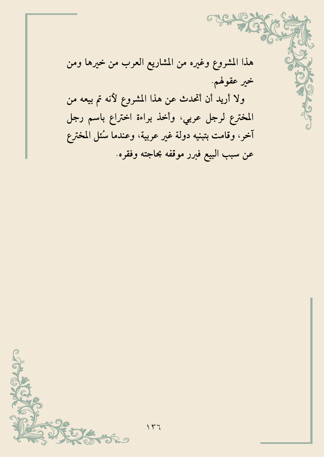 ولا أريد أن أتحدث عن هذا المشروع لأنه تم بيعه من المخترع لرجل عربي، وأخذ براءة اختراع باسم رجل آخر، وقامت بتبنيه دولة غير عربية، وعندما سُئل المخترع عن سبب البيع فبرر موقفه بحاجته وفقره.