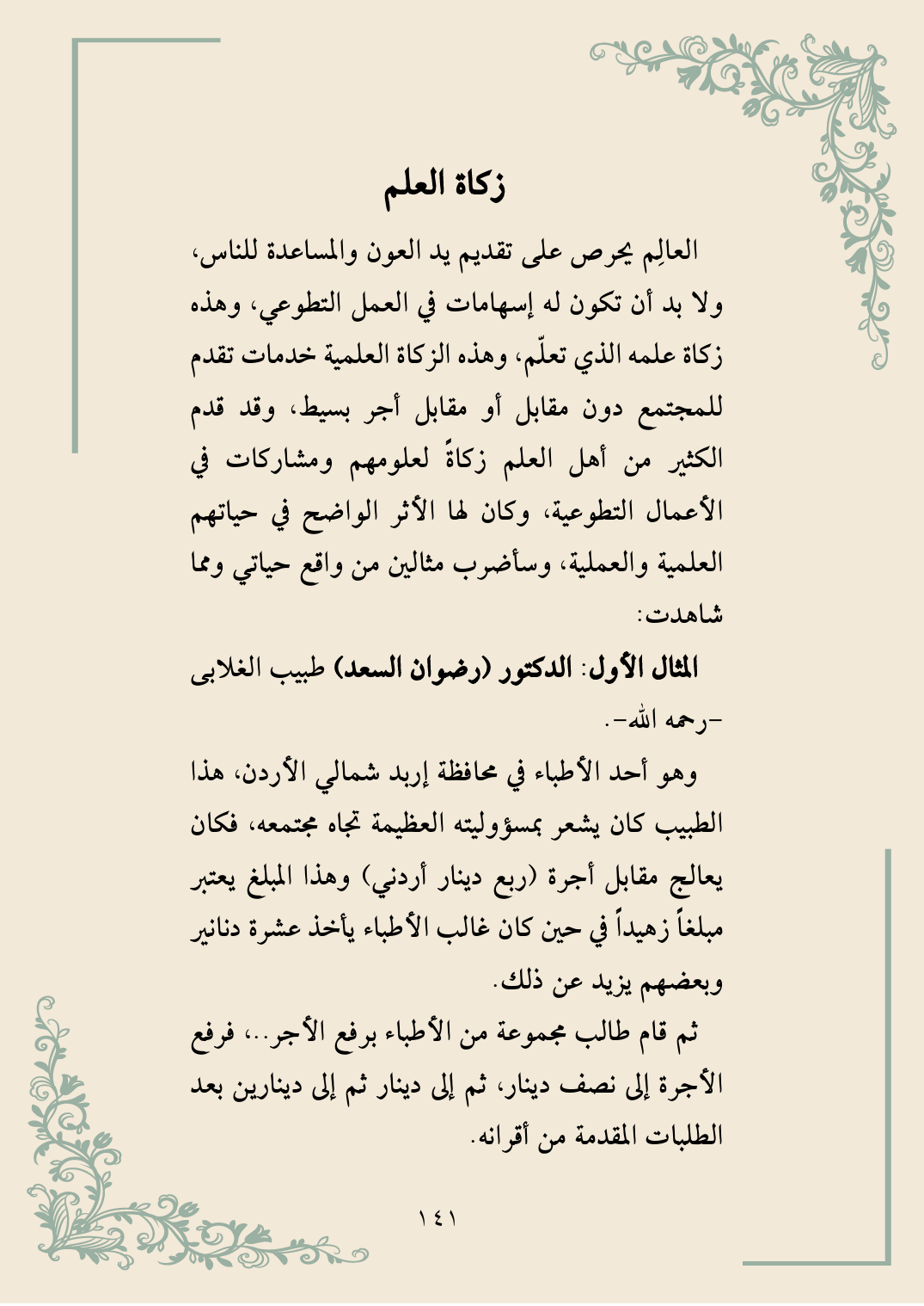 العالِم يحرص على تقديم يد العون والمساعدة للناس، ولا بد أن تكون له إسهامات في العمل التطوعي، وهذه زكاة علمه الذي تعلّم، وهذه الزكاة العلمية خدمات تقدم للمجتمع دون مقابل أو مقابل أجر بسيط، وقد قدم الكثير من أهل العلم زكاةً لعلومهم ومشاركات في الأعمال التطوعية، وكان لها الأثر الواضح في حياتهم العلمية والعملية، وسأضرب مثالين من واقع حياتي ومما شاهدت: