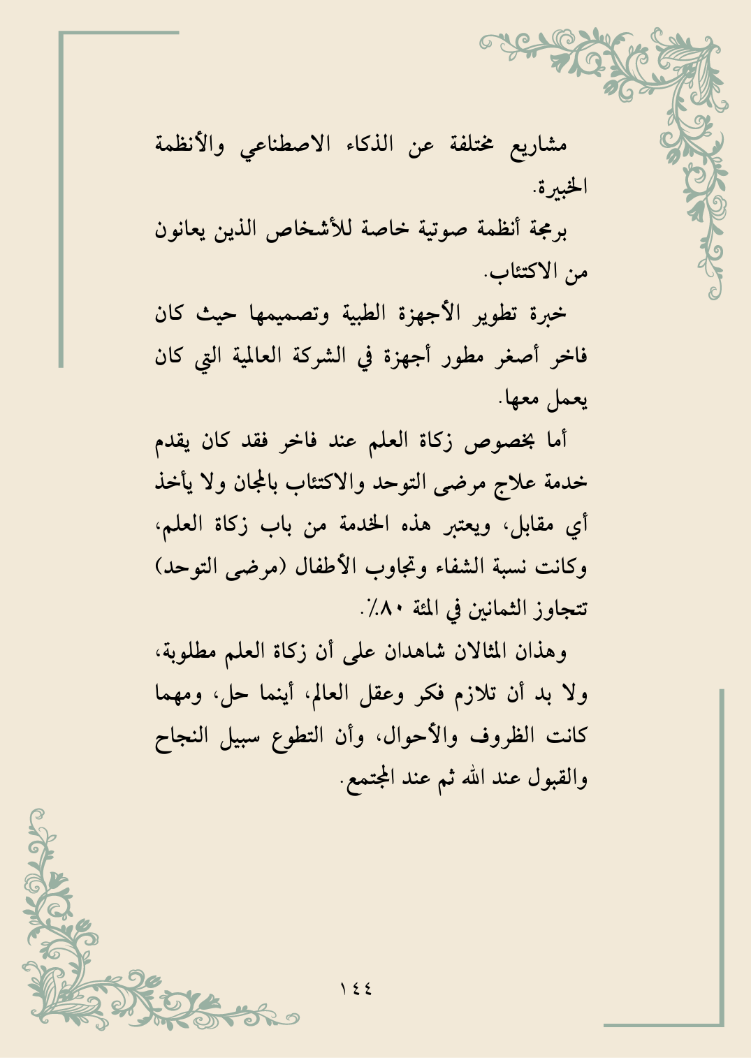 أما بخصوص زكاة العلم عند فاخر فقد كان يقدم خدمة علاج مرضى التوحد والاكتئاب بالمجان ولا يأخذ أي مقابل، ويعتبر هذه الخدمة من باب زكاة العلم، وكانت نسبة الشفاء وتجاوب الأطفال (مرضى التوحد) تتجاوز الثمانين في المئة ٨٠%.