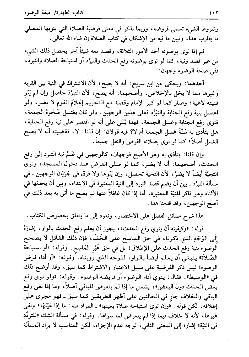 قوله: "وكيفيته أن ينوي رفع الحدث"، يجوز أن يعلم رفع الحدث بالواو، إشَارَةً إِلَى الوَجْهِ الذي ذكرنا، في حق الماسح على الخُفِّ، فإن ذلك القائل لا يصحح الوضوء بنية رفع الحدث على الإطلاق؛ بل في حق غَيْرِ المَاسِحِ. وقوله: "أو استباحة الصَّلاَة" ينبغي أن يعلم أيضاً بالواو، للوجه الذي رويناه. وقوله: "أو أداء فرض الوضوء" ليس ذكر الفرضية على سبيل الاعتبار والاشتراط كما سبق، وقد أوضح ذلك في "الوسيط". فقال: ينوي أداء الوضوء أو فريضة الوضوء. وقوله: "ولو نوى رفع بعض الحدث دون البعض"، يشمل ما إذا لم يتعرض للباقي أصلاً، وما إذا نفى رفع الباقي والخلاف جارٍ في الحالتين على أظهر الطريقين كما سبق -فهو مجرى على إطلاقه، لكن قوله: "وإن نوى استباحة صلاة بعينها"- المراد منه: ما إذا عَيِّنَهَا؛ ونفى غيرها، لأنه لا خلاف فيما إذا لم يتعرض لما سواها. وقوله: في مسألة الشك "للتردُّدِ في النيّة" إشارة إلى المعنى الثاني، لوجه عدم الإجزاء، لكن المناسب لا يراد المسألة