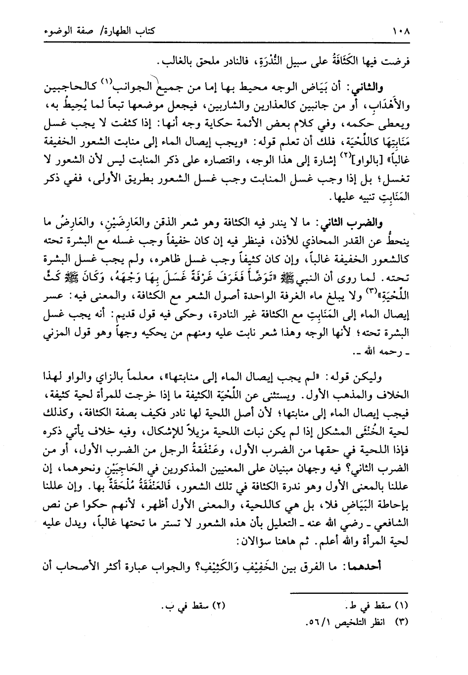 وليكن قوله: "لم يجب إيصال الماء إلى منابتها"، معلماً بالزاي والواو لهذا الخلاف والمذهب الأول. ويستثنى عن اللِّحْيَة الكثيفة ما إذا خرجت للمرأة لحية كثيفة، فيجب إيصال الماء إلى منابتها؛ لأن أصل اللحية لها نادر فكيف بصفة الكثافة، وكذلك لحية الخُنْثَى المشكل إذا لم يكن نبات اللحية مزيلاً للإشكال، وفيه خلاف يأتي ذكره فإذا اللحية في حقها من الضرب الأول، وعَنْفَقةُ الرجل من الضرب الأول، أو من الضرب الثاني؟ فيه وجهان مبنيان على المعنيين المذكورين في الحَاجِبَيْن ونحوهما، إن عللنا بالمعنى الأول وهو ندرة الكثافة في تلك الشعور، فَالعَنْفَقَةُ مُلحَقَةٌ بها. وإن عللنا بإحاطة البَيَاضِ فلا، بل هي كاللحية، والمعنى الأول أظهر، لأنهم حكوا عن نص الشافعي -رضي الله عنه- التعليل بأن هذه الشعور لا تستر ما تحتها غالباً، ويدل عليه لحية المرأة والله أعلم. ثم هاهنا سؤالان: