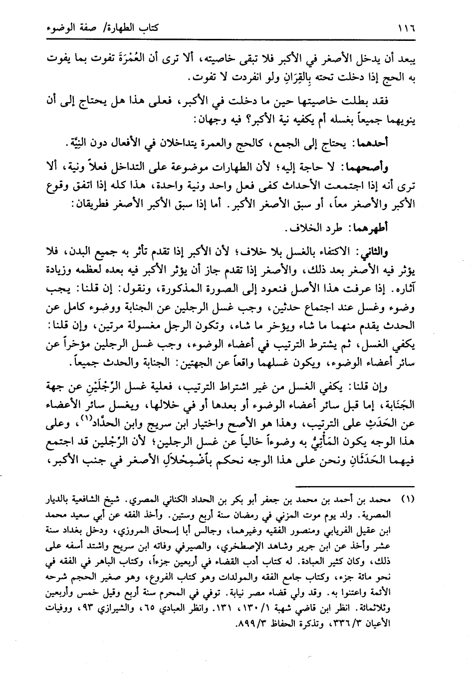 وأصحهما: لا حاجة إليه؛ لأن الطهارات موضوعة على التداخل فعلاً ونية، ألا ترى أنه إذا اجتمعت الأحداث كفى فعل واحد ونية واحدة، هذا كله إذا اتفق وقوع الأكبر والأصغر معاً، أو سبق الأصغر أكبر. أما إذا سبق الاكبر الأصغر فطريقان: