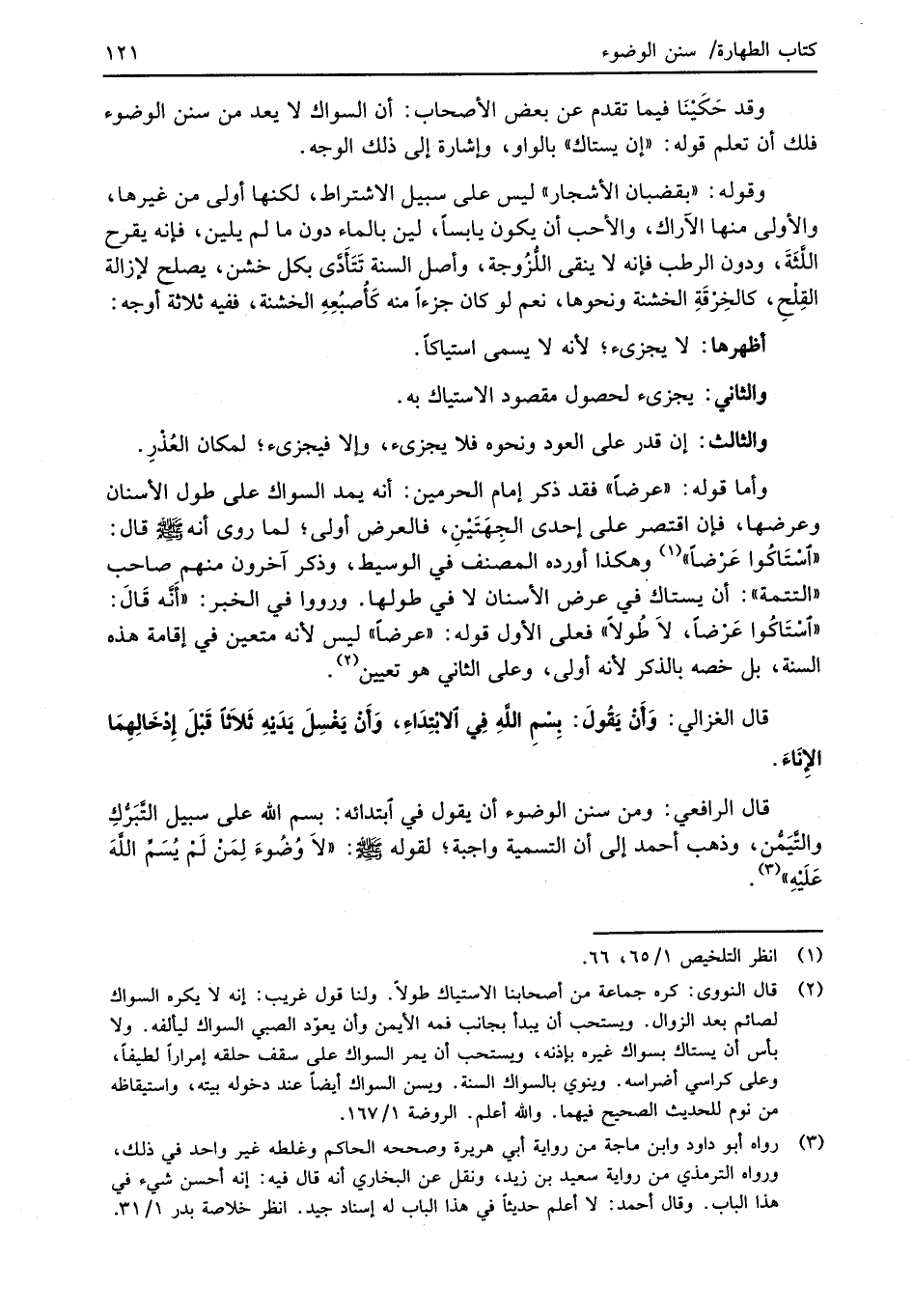 (¬2) قال النووى: كره جماعة من أصحابنا الاستياك طولاً. ولنا قول غريب: إنه لا يكره السواك لصائم بعد الزوال. ويستحب أن يبدأ بجانب فمه الأيمن وأن يعوّد الصبي السواك ليألفه. ولا بأس أن يستاك بسواك غيره بإذنه، ويستحب أن يمر السواك على سقف حلقه إمراراً لطيفاً، وعلى كراسي أضراسه. وينوي بالسواك السنة. ويسن السواك أيضاً عند دخوله بيته، واستيقاظه من نوم للحديث الصحيح فيهما. والله أعلم. الروضة 1/ 167.