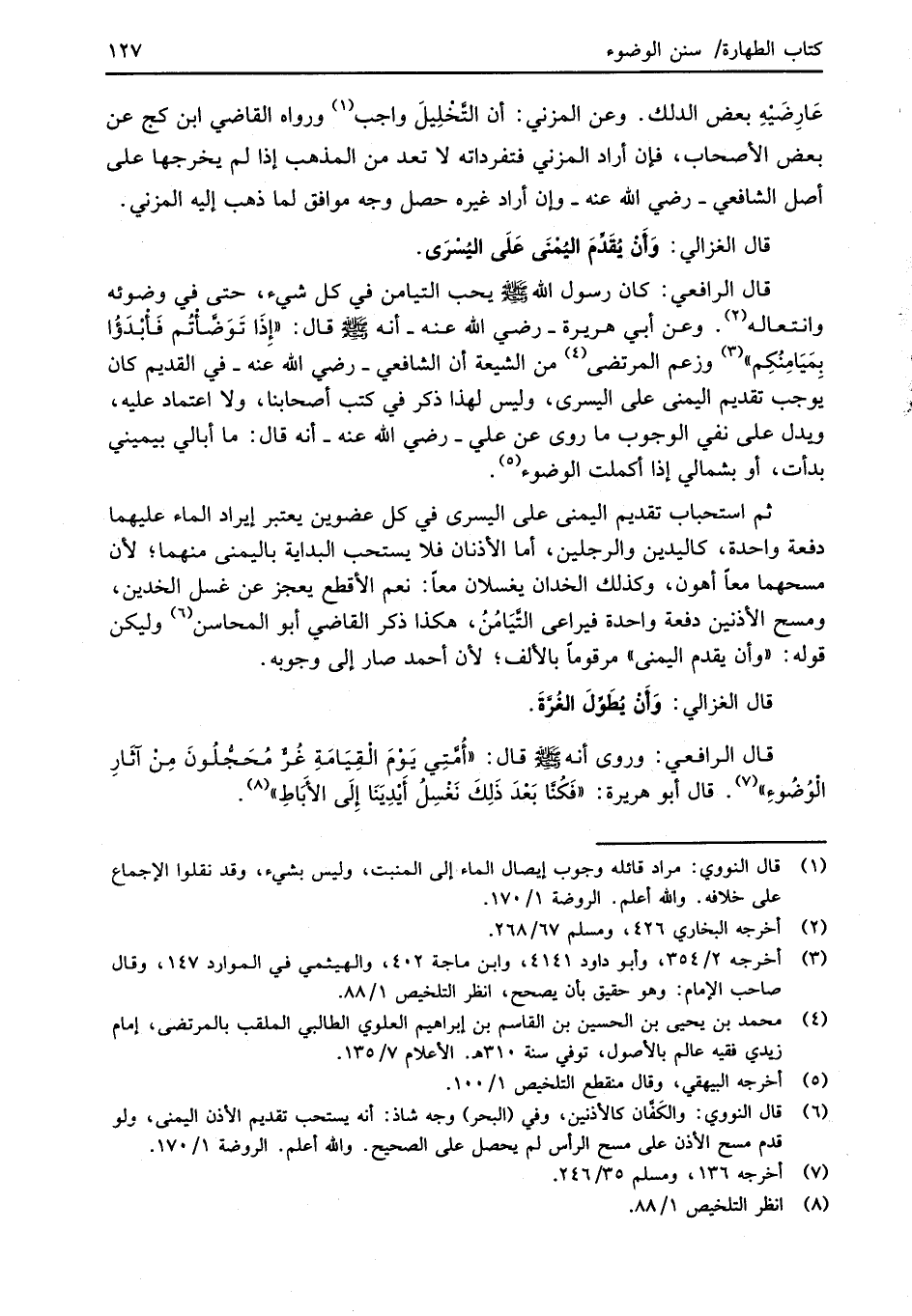 قال الرافعي: كان رسول الله -صلى الله عليه وسلم- يحب التيامن في كل شيء، حتى في وضوئه وانتعاله (¬2). وعن أبي هريرة -رضي الله عنه- أنه -صلى الله عليه وسلم- قال: "إِذَا تَوَضَّأتم فَأْبْدَؤُا بِمَيَامِنُكِم" (¬3) وزعم المرتضى (¬4) من الشيعة أن الشافعي -رضي الله عنه- في القديم كان يوجب تقديم اليمنى على اليسرى، وليس لهذا ذكر في كتب أصحابنا، ولا اعتماد عليه، ويدل على نفي الوجوب ما روى عن علي -رضي الله عنه- أنه قال: ما أبالي بيميني بدأت، أو بشمالي إذا أكملت الوضوء (¬5).