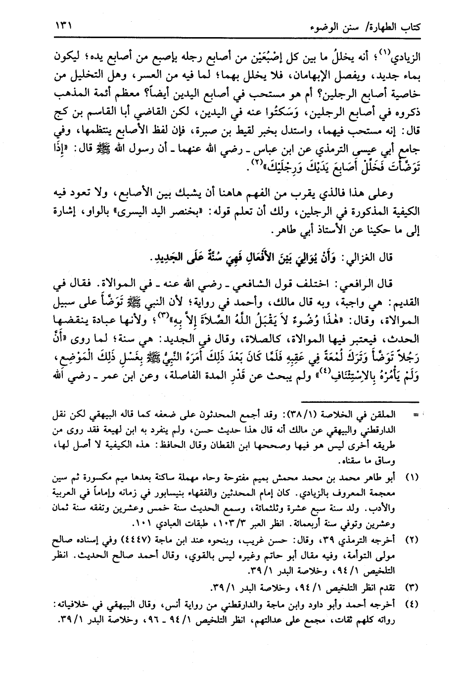 (¬4) أخرجه أحمد وأبو داود وابن ماجة والدارقطني من رواية أنس، وقال البيهقي في خلافياته: رواته كلهم ثقات، مجمع على عدالتهم، انظر التلخيص 1/ 94 - 96، وخلاصة البدر 1/ 39.