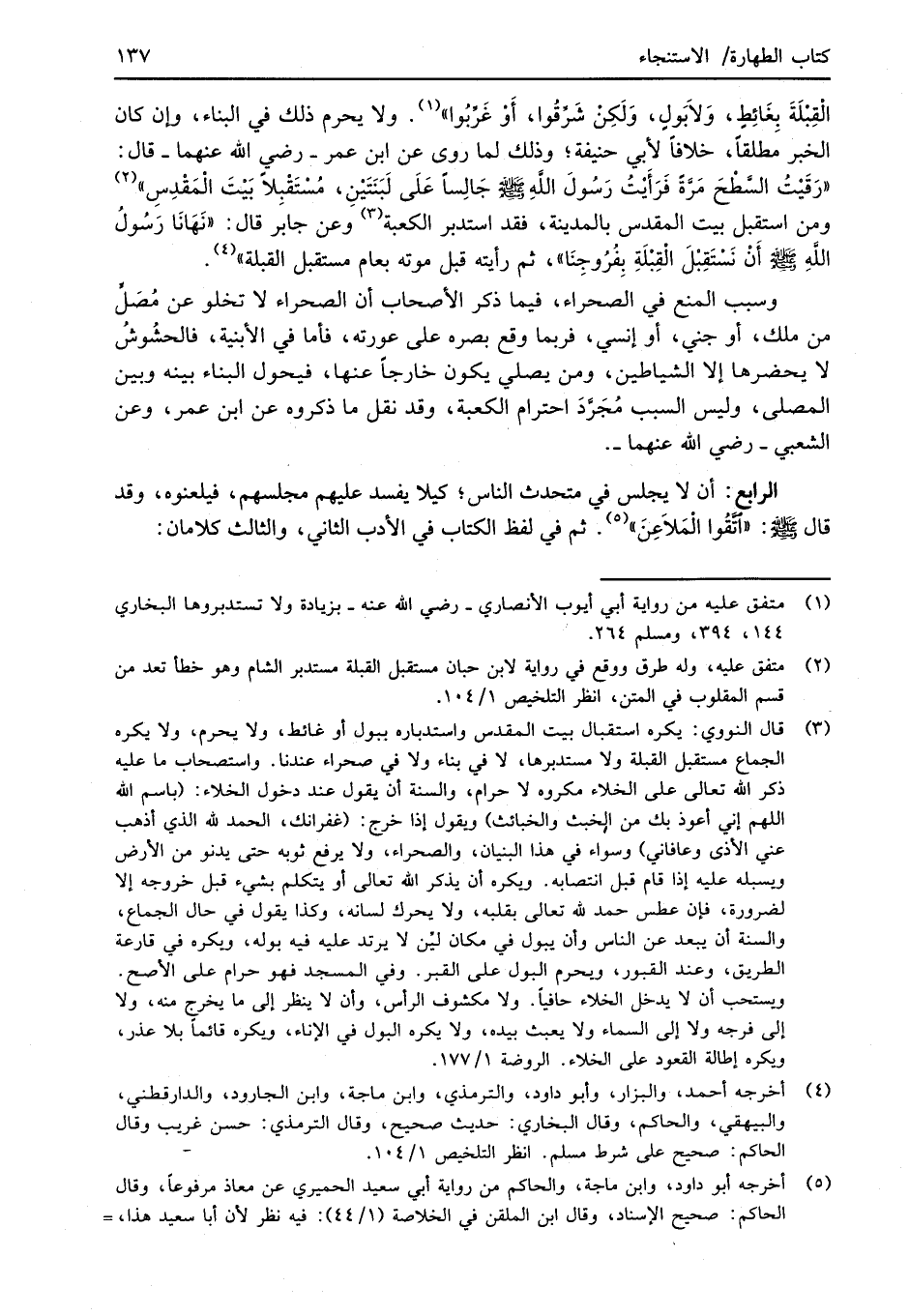 (¬1) متفق عليه من رواية أبي أيوب الأنصاري -رضي الله عنه- بزيادة ولا تستدبروها البخاري 144، 394، ومسلم 264.