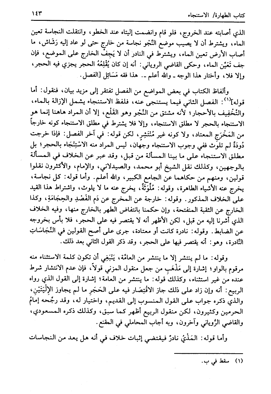 وقوله: ما لم ينتشر إلا ما ينتشر من العامَّة، يَنْبَغِي أن تكون كلمة الاستثناء منه مرقوم بالواو؛ إشارة إلى مَذْهَب من جعل منقول المزني قولاً، فإن عدم الانتشار شرط عنده من غير استثناء، وكذلكَ قوله: ما ينتشر من العامة؛ إشارة إلى القول الذي رواه الربيع: أنه وإن زاد على ذلك جاز الاقْتِصَار فيه على الحَجَرِ ما لم يجاوز الإلْيَتَيْنِ، والذي ذكره جواب على القول المنسوب إلى القديم، واختيار له، وقد رجّحَه إمامُ الحرمين وكثيرون، لكن منقول الربيع أظهر كما سبق، وكذلك ذكره المسعودي، والقاضي الرُّوياني وآخرون، وبه أجاب المحاملي في المقنع.