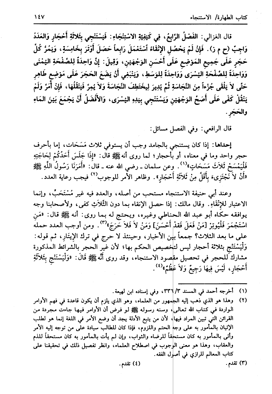 قال الغزالي: الفَصْلُ الرَّابعُ، فِي كَيْفِيَّةِ الاسْتِنْجَاءِ: فَيَسْتَنْجِي بِثَلاَثةِ أَحْجَار وَالعَدَدُ وَاجِبٌ (ح م ز). فَإِنْ لَمْ يَحْصُلِ الإِنْقَاءُ اسْتَعمَلَ رَابِعاً حَصَلَ أَوْتَرَ بِخَامِسَةٍ، وَيَمُرُّ كُلَّ حَجَرٍ عَلَى جَمِيعِ المَوضِعِ عَلَى أَحْسَنِ الوَجْهَينِ، وَقِيلَ: إِنَّ وَاحِدَةٌ لِلصَّفْحَةِ اليُمْنَى وَوَاحِدَةً لِلصَّفْحَةِ اليُسْرَى وَوَاحِدَةً لِلوَسَطِ، وَينْبَغِي أَنْ يَضَعَ الحَجَرَ عَلَى مَوْضِع طَاهِرِ حَتَّى لاَ يَلْقَى جُزْءاً مِنَ النَّجَاسَةِ ثُمَّ يُدِير لِيخَتَطِفَ النَّجَاسَةَ وَلاَ يُمِرَّ فَيَنْقُلُهَا، فَإنْ أمَرَّ وَلَمْ يَنْقُلْ كَفَى عَلَى أَصَحَّ الوَجْهيْنِ وَيَسْتَنْجِي بِيَدِهِ اليُسْرَى، وَالأَفْضَلُ أَنْ يَجْمَعَ بَيْنَ المَاءِ والحَجَرِ.