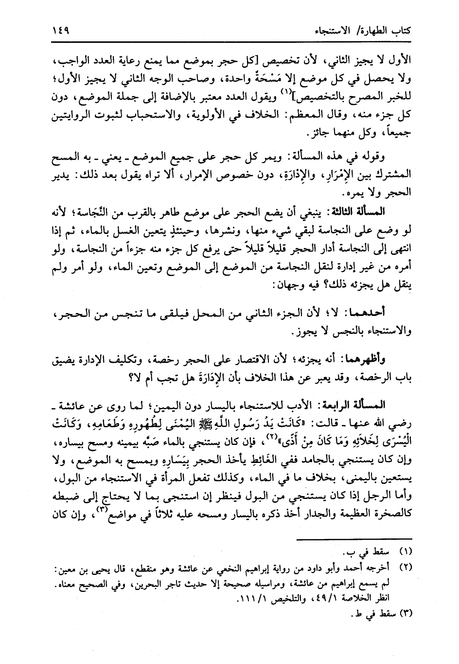 المسألة الثالثة: ينبغي أن يضع الحجر على موضع طاهر بالقرب من النَّجَاسة؛ لأنه لو وضع على النجاسة لبقي شيء منها، ونشرها، وحينئذٍ يتعين الغسل بالماء، ثم إذا انتهى إلى النجاسة أدار الحجر قليلاً قليلاً حتى يرفع كل جزء منه جزءاً من النجاسة، ولو أمره من غير إدارة لنقل النجاسة من الموضع إلى الموضع وتعين الماء، ولو أمر ولم ينقل هل يجزئه ذلك؟ فيه وجهان: