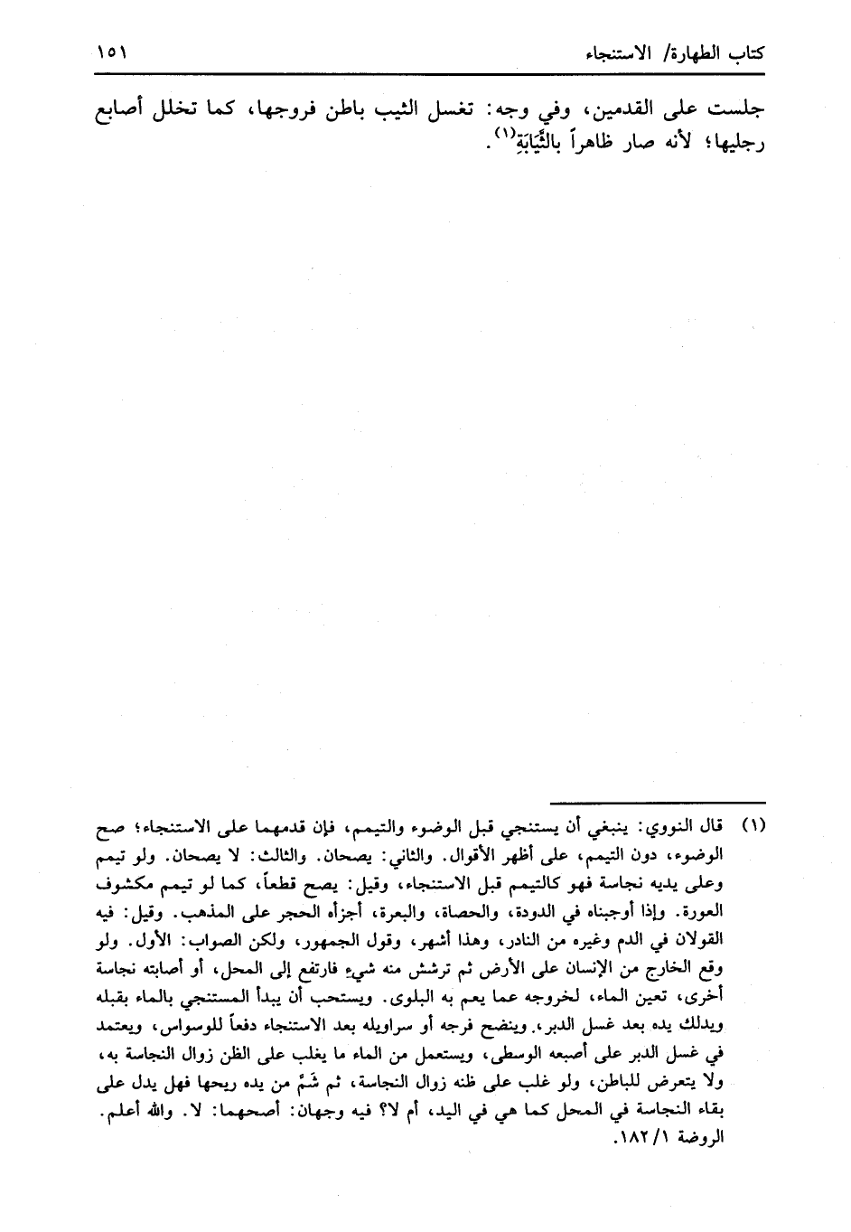 (¬1) قال النووي: ينبغي أن يستنجي قبل الوضوء والتيمم، فإن قدمهما على الاستنجاء؛ صح الوضوء، دون التيمم، على أظهر الأقوال. والثاني: يصحان. والثالث: لا يصحان. ولو تيمم وعلى يديه نجاسة فهو كالتيمم قبل الاستنجاء، وقيل: يصح قطعاً، كما لو تيمم مكشوف العورة. وإذا أوجباه في الدودة، والحصاة، والبعرة، أجزأه الحجر على المذهب. وقيل: فيه القولان في الدم وغيره من النادر، وهذا أشهر، وقول الجمهور، ولكن الصواب: الأول. ولو وقع الخارج من الإنسان على الأرض ثم ترشش منه شيء فارتفع إلى المحل، أو أصابته نجاسة أخرى، تعين الماء، لخروجه عما يعم به البلوى. ويستحب أن يبدأ المستنجي بالماء بقبله ويدلك يده بعد غسل الدبر، وينضح فرجه أو سراويله بعد الاستنجاء دفعاً للوسواس، ويعتمد في غسل الدبر على أصبعه الوسطى، ويستعمل من الماء ما يغلب على الظن زوال النجاسة به، ولا يتعرض للباطن، ولو غلب على ظنه زوال النجاسة، ثم شَمَّ من يده ريحها فهل يدل على بقاء النجاسة في المحل كما هي في اليد، أم لا؟ فيه وجهان: أصحهما: لا. والله أعلم. الروضة 1/ 182.