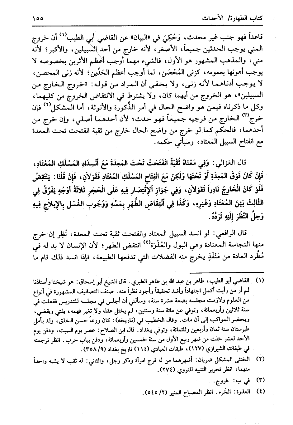 قال الغزالي: وَفِي مَعْنَاهُ ثُقْبَةٌ انْفَتَحَتْ تَحْتَ المَعِدَةَ مَعَ انْسِدَادِ المَسْلَكِ المُعْتَادِ، فَإِنْ كَانَ فَوْقَ المَعِدَةِ أَوْ تَحْتَهَا وَلَكِنْ مَعَ انْفِتَاحِ المَسْلَكِ المُعْتَادِ فَقَوْلاَنِ، فَإِنْ قُلْنَا: يَنْتَقِضُ فَلَوْ كَانَ الْخَارجُ نَادِراً فَقَوْلاَنِ، وَفِي جَوَازِ الإِقْتِصَارِ فِيهِ عَلَى الْحَجَرِ ثَلاثَةُ أوْجُهِ يُفَرَّقُ فِي الثَّالِثَ بَيْنَ المُعْتَادِ وَغَيْرِهِ، وَكَذَا فِي انْتِقَاضِ الطُّهْرِ بِمَسِّهِ وَوُجُوبِ الغُسْل بِالإِيلاجِ فِيهِ وَحِلِّ النَّظَرَ إِلَيْهِ تَرَدُّدٌ.