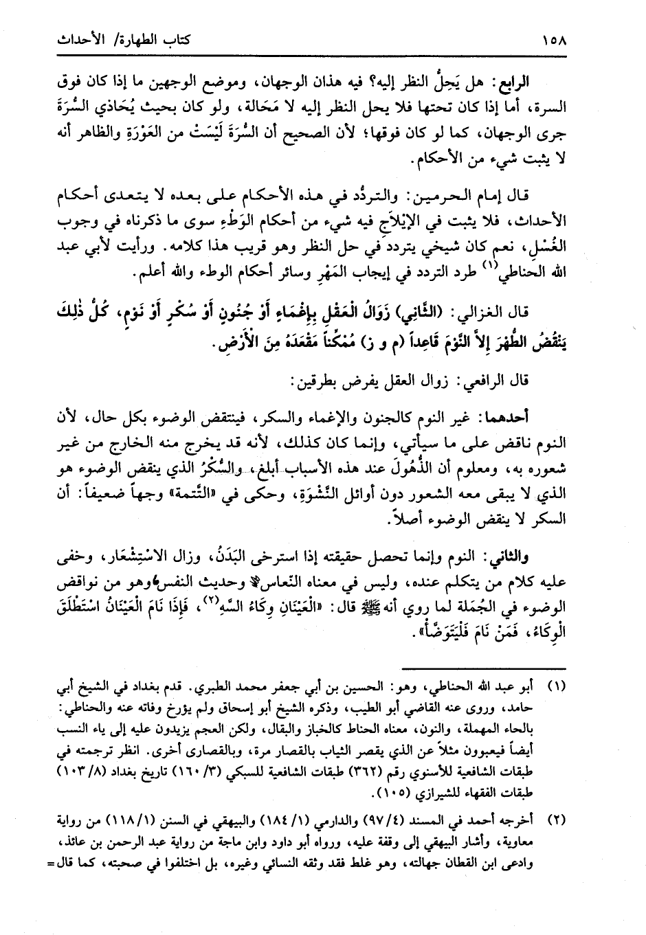 قال الغزالي: (الثَّانِي) زَوَالُ الْعَقْلِ بِإغْمَاء أَوْ جُنُونٍ أَوْ سُكْرٍ أَوْ نَوْمٍ، كُلُّ ذلِكَ يَنْقُضُ الطُّهْرَ إِلاَّ النَّوْمَ قَاعِدًا (م وز) مُمْكِّناً مَقْعَدَهُ مِنَ الْأَرْضِ.