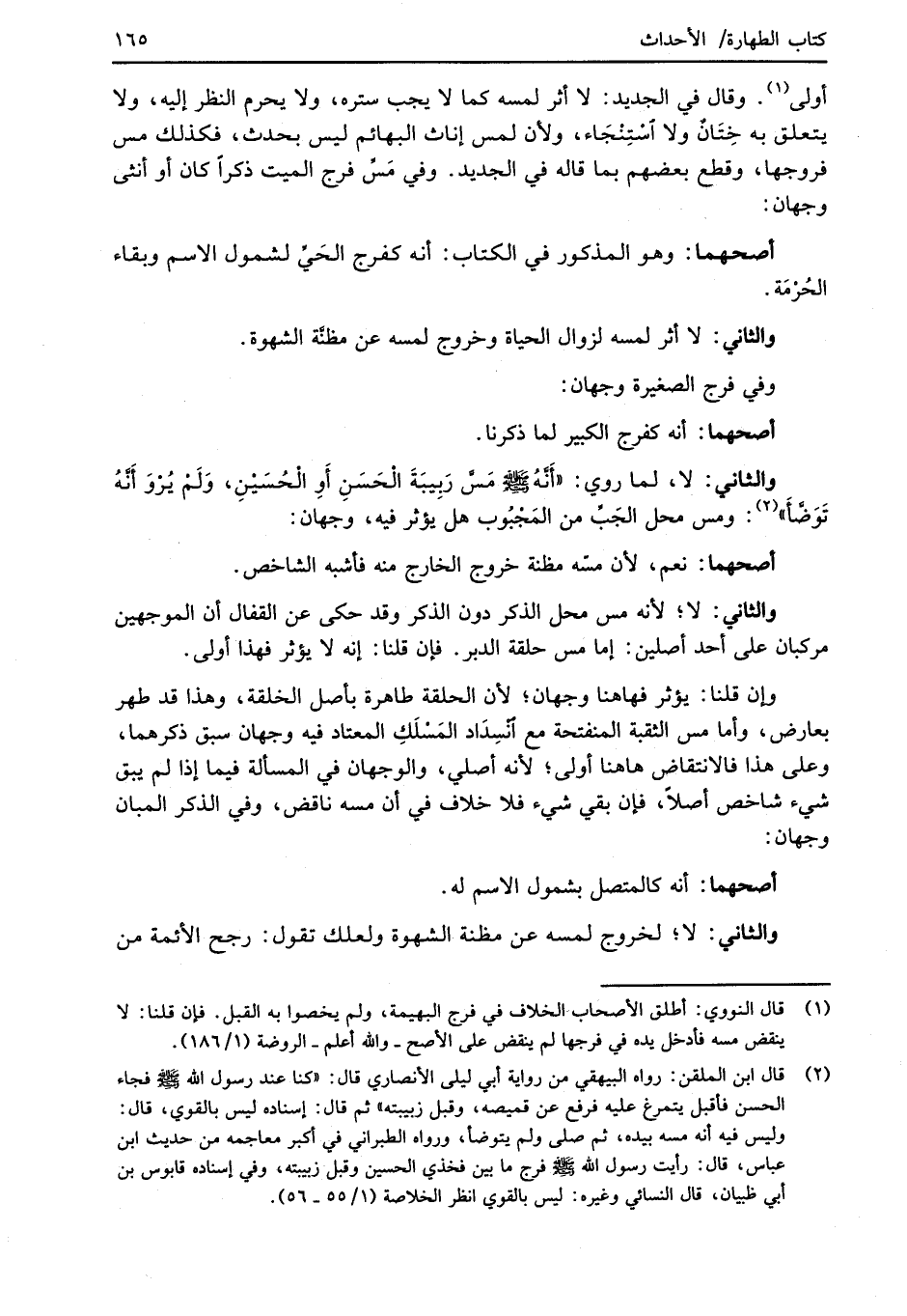 (¬2) قال ابن الملقن: رواه البيهقي من رواية أبي ليلى الأنصاري قال: "كنا عند رسول الله -صلى الله عليه وسلم- فجاء الحسن فأقبل يتمرغ عليه فرفع عن قميصه، وقبل زبيبته" ثم قال: إسناده ليس بالقوي، قال: وليس فيه أنه مسه بيده، ثم صلى ولم يتوضأ، ورواه الطبراني في أكبر معاجمه من حديث ابن عباس، قال: رأيت رسول الله -صلى الله عليه وسلم- فرج ما بين فخذي الحسين وقبل زبيبته، وفي إسناده قابوس بن أبي ظبيان، قال النسائي وغيره: ليس بالقوي انظر الخلاصة (1/ 55 - 56).