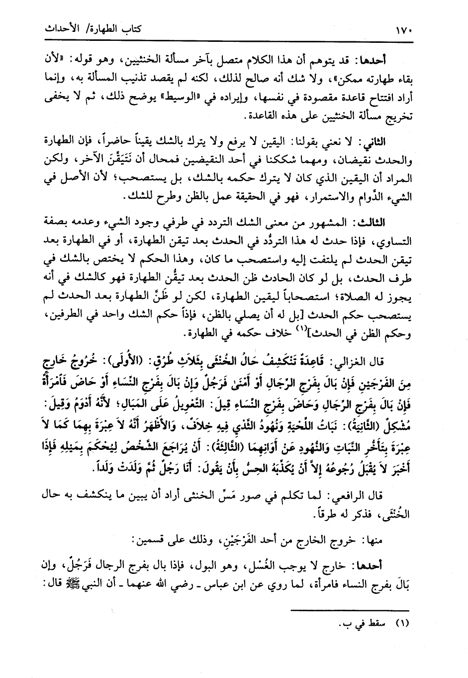 أحدها: قد يتوهم أن هذا الكلام متصل بآخر مسألة الخنثيين، وهو قوله: "لأن بقاء طهارته ممكن"، ولا شك أنه صالح لذلك، لكنه لم يقصد تذنيب المسألة به، وإنما أراد افتتاح قاعدة مقصودة في نفسها، وإيراده في "الوسيط" يوضح ذلك، ثم لا يخفى تخريج مسألة الخنثيين على هذه القاعدة.
