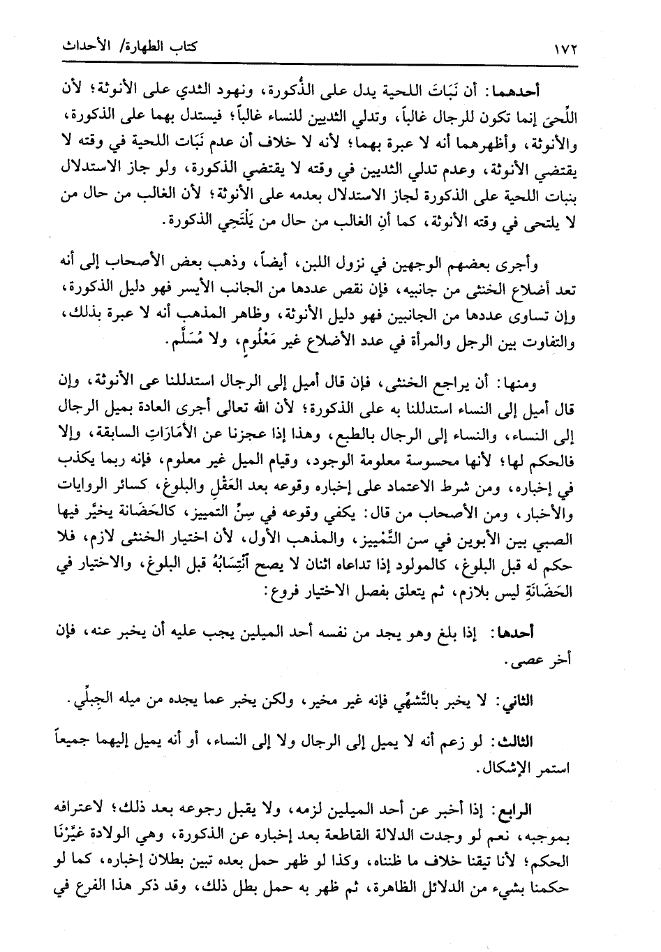 أحدهما: أن نَبَاتَ اللحية يدل على الذُّكورة، ونهود الثدي على الأنوثة؛ لأن اللِّحىَ إنما تكون للرجال غالباً، وتدلي الثديين للنساء غالباً؛ فيستدل بهما على الذكورة، والأنوثة، وأظهرهما أنه لا عبرة بهما؛ لأنه لا خلاف أن عدم نَبَات اللحية في وقته لا يقتضي الأنوثة، وعدم تدلي الثديين في وقته لا يقتضي الذكورة، ولو جاز الاستدلال بنبات اللحية على الذكورة لجاز الاستدلال بعدمه على الأنوثة؛ لأن الغالب من حال من لا يلتحى في وقته الأنوثة، كما أنِ الغالب من حال من يَلْتَحِي الذكورة.