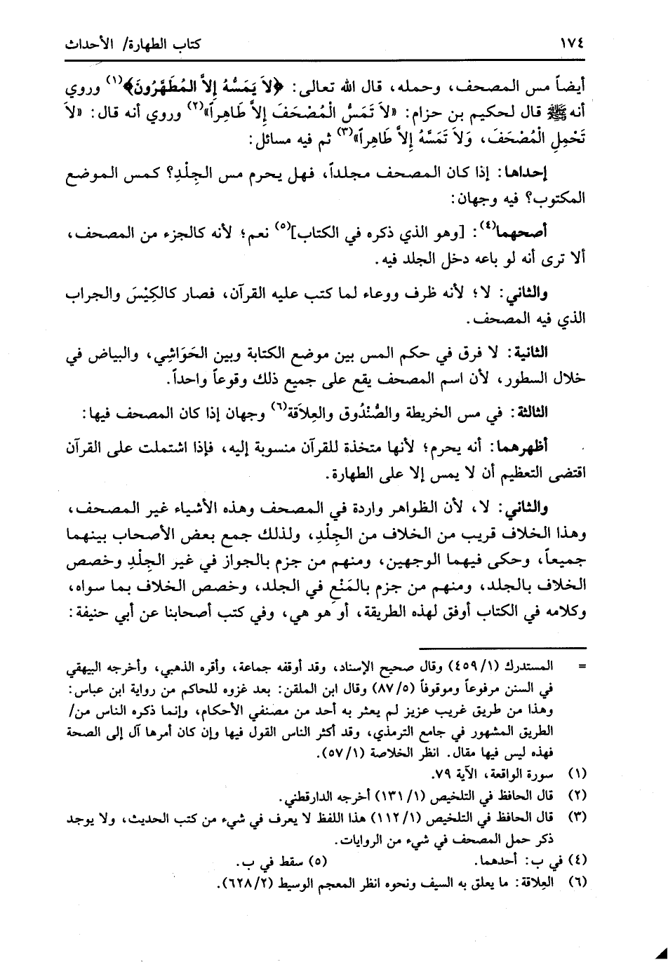 (¬3) قال الحافظ في التلخيص (1/ 112) هذا اللفظ لا يعرف في شيء من كتب الحديث، ولا يوجد ذكر حمل المصحف في شيء من الروايات.