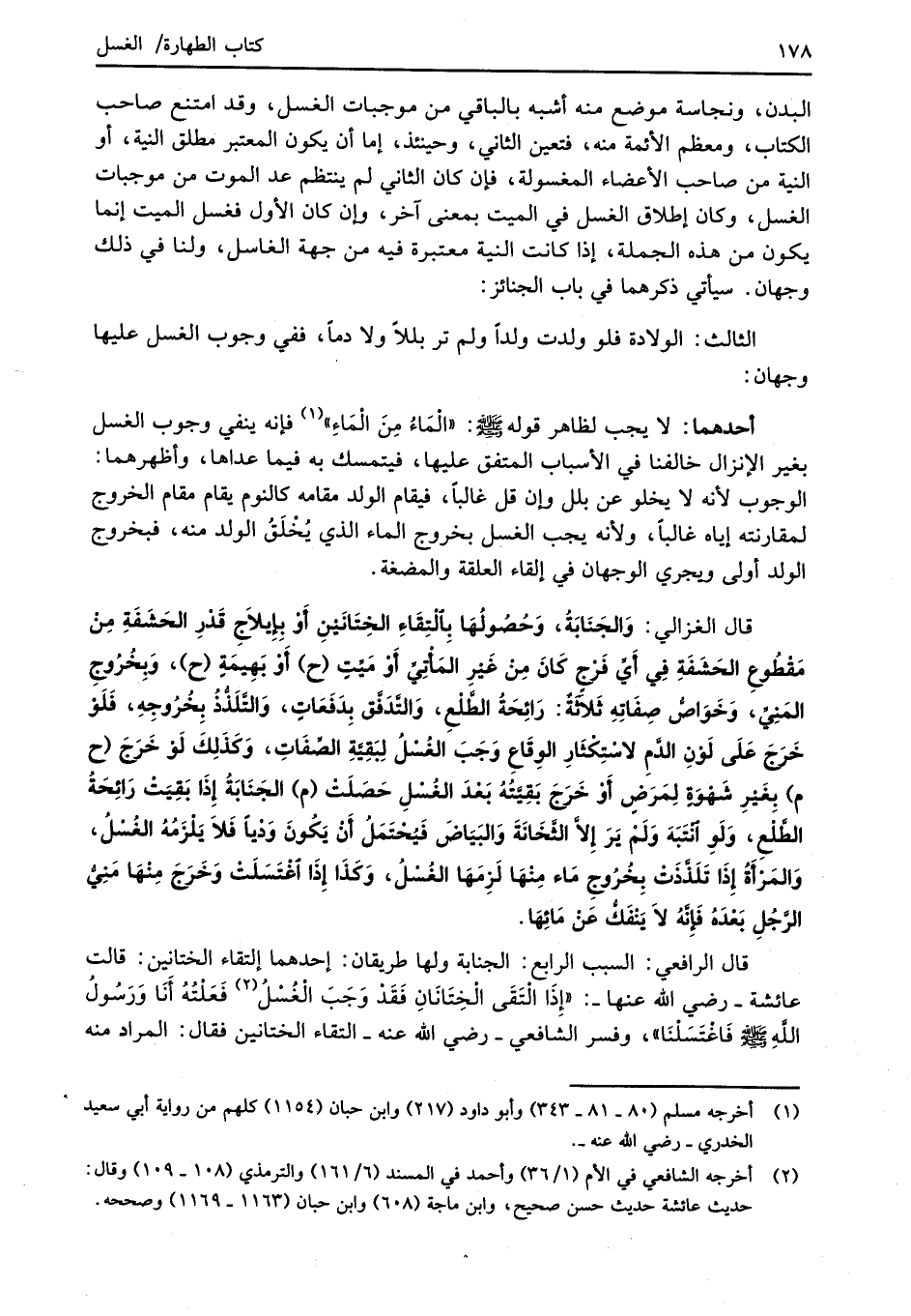 قال الغزالي: وَالجَنَابَةُ، وَحُصُولُهَا بِالْتِقَاءِ الخِتَانَيْنِ أَوْ بِإيلاجَ قَدْرِ الحَشَفَةِ مِنْ مَقْطُوعِ الحَشَفَةِ فِي أَيِّ فَرْج كانَ مِنْ غَيْرِ المَأْتِيِّ أَوْ مَيِّتٍ (ح) أَوْ بَهِيمَةٍ (ح)، وَبِخُرُوجِ المَنِيِّ، وَخَوَاصُّ صِفَاتِهِ ثَلاَثَةٌ: رَائِحَةُ الطَّلْعِ، وَالتَّدَفَّق بِدَفَعَاتٍ، وَالتَّلَذُّذُ بِخُرُوجِهِ، فَلَوْ خَرَجَ عَلَى لَوْنِ الدَّمِ لاسْتِكْثَارِ الوِقَاعِ وَجَبَ الغُسْلُ لِبَقِيَّةِ الصِّفَاتِ، وَكَذَلِكَ لَوْ خَرَجَ (ح م) بِغَيْرِ شَهْوَةٍ لِمَرَضٍ أَوْ خَرَجَ بَقِيَّتُهُ بَعْدَ الغُسْلِ حَصَلَتْ (م) الجَنَابَةُ إذَا بَقِيَتْ رَائِحَةُ الطَّلْعِ، وَلَوِ انْتَبَهَ وَلَمْ يَرَ إلاَّ الثَّخَانَةَ وَالبَيَاضَ فَيُحْتَمَلُ أَنْ يَكُونَ وَدْيًا فَلاَ يَلزَمُهُ الغُسْلُ، وَالمَرْأَةُ إذَا تَلَذَّذَتْ بِخُرُوجِ مَاء مِنْهَا لَزِمَهَا الغُسْلُ، وَكَذَا إِذَا اغْتَسَلَتْ وَخَرَجَ مِنْهَا مَنِيُّ الرَّجُلِ بَعْدَهُ فَإنَّهُ لاَ يَنْفَكُّ عَنْ مَائِهَا.