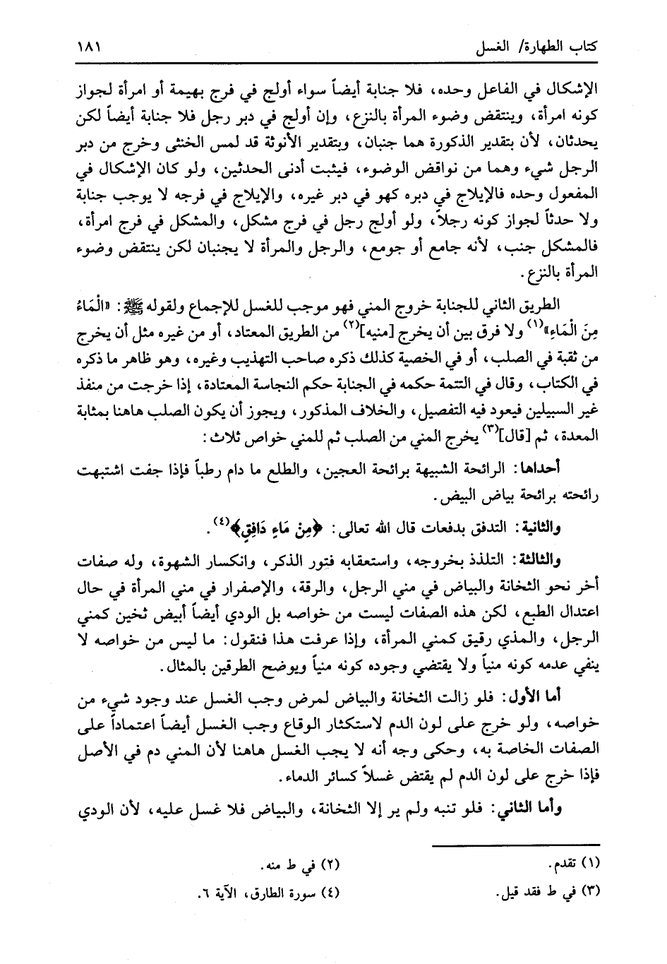 والثالثة: التلذذ بخروجه، واستعقابه فتور الذكر، وانكسار الشهوة، وله صفات أخر نحو الثخانة والبياض في مني الرجل، والرقة، والاصفرار في مني المرأة في حال اعتدال الطبع، لكن هذه الصفات ليست من خواصه بل الودي أيضاً أبيض ثخين كمني الرجل، والمذي رقيق كمني المرأة، لماذا عرفت هذا فنقول: ما ليس من خواصه لا ينفي عدمه كونه منياً ولا يقتضي وجوده كونه منياً ويوضح الطرقين بالمثال.