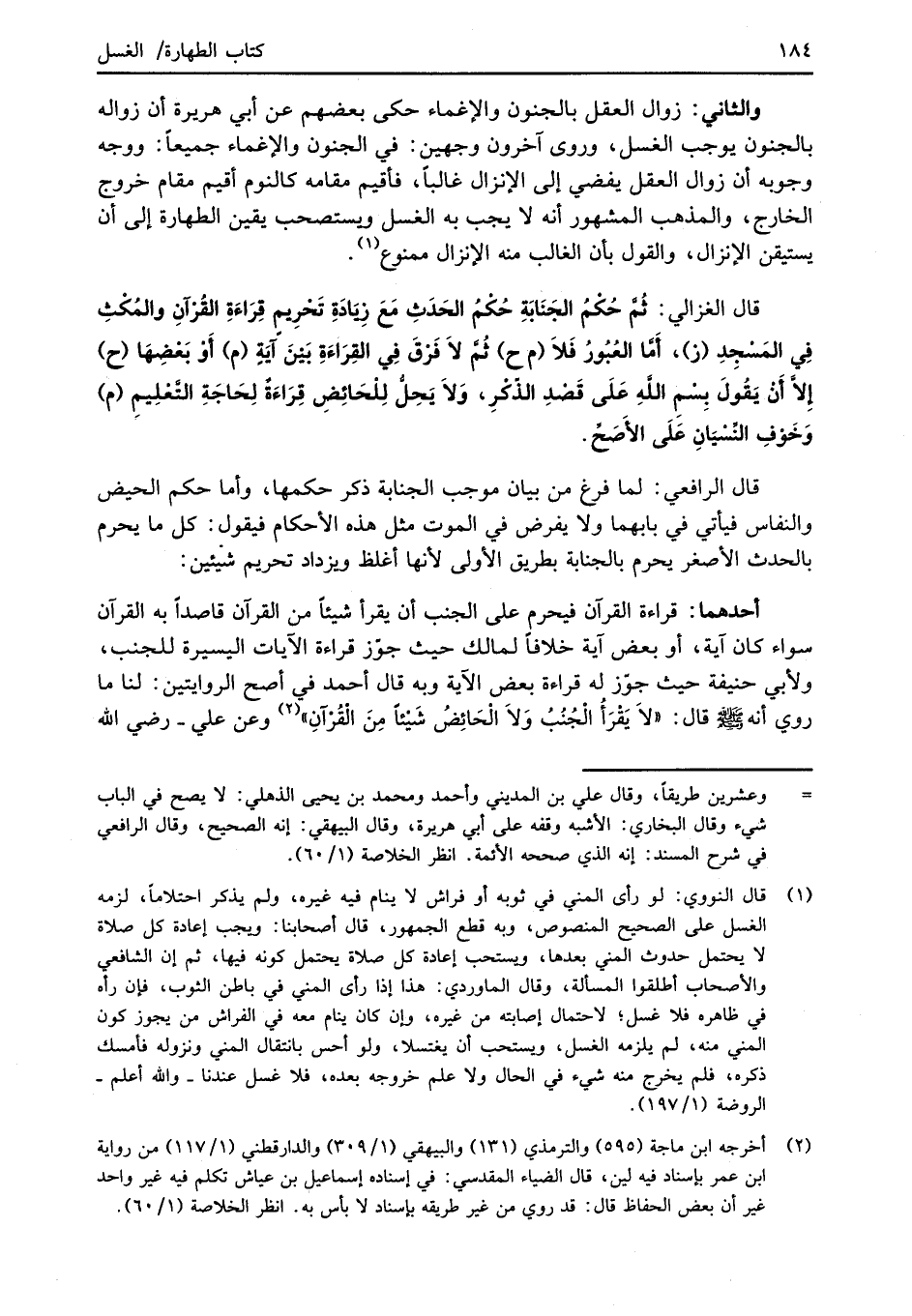 قال الغزالي: ثُمَّ حُكْمُ الجَنَابَةِ حُكْمُ الحَدَثِ مَعَ زَيادَةِ تَحْرِيم قِرَاءَةِ القُرْآنِ والمُكْثِ فِي المَسْجِدِ (ز)، أَمَّا العُبُورُ فَلاَ (م ح) ثُمَّ لاَ فَرْقَ فِي القِرَاءَةِ بَيْنَ آيَةٍ (م) أَوْ بَعْضِهَا (ح) إلاَّ أَنْ يَقُولَ بِسْمِ الله عَلَى قَصْدِ الذّكْرِ، وَلاَ يَحِلُّ لِلْحَائِضِ قِرَاءَةٌ لِحَاجَةِ التَّعْلِيمِ (م) وَخَوْفِ النِّسْيَانِ عَلَى الأَصَحِّ.