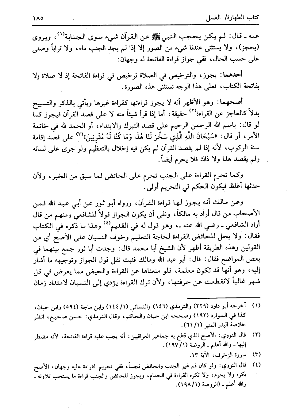 (¬4) قال النووي: ولو كان فم غير الجنب والحائض نجساً، ففي تحريم القراءة عليه وجهان، الأصح يكره ولا يحرم، ولا تكره القراءة في الحمام، ويجوز للحائض والجنب قراءة ما يستحب تلاوته -والله أعلم- الروضة (1/ 198).