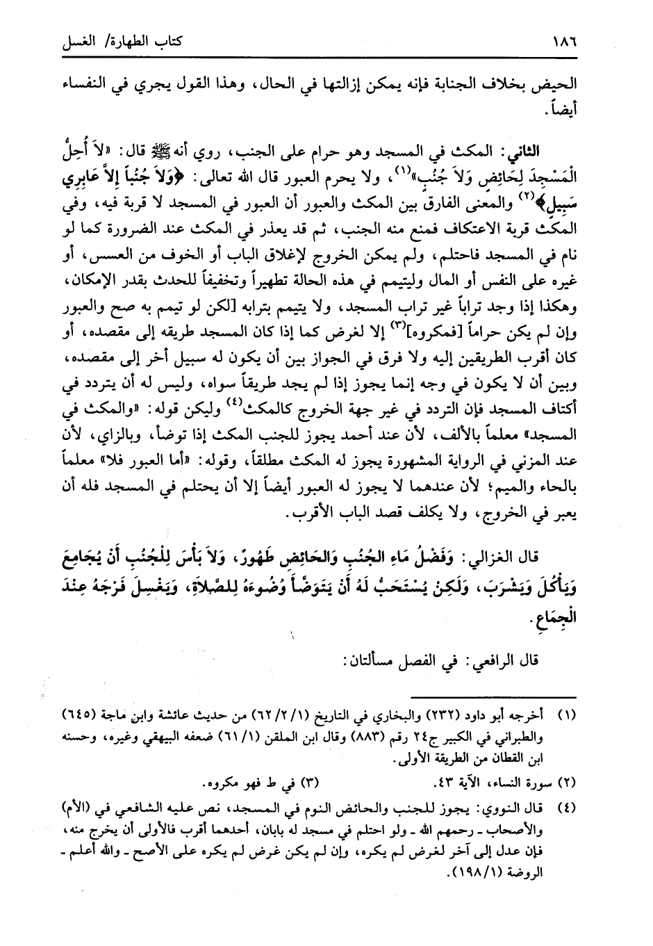 (¬4) قال النووي: يجوز للجنب والحائض النوم في المسجد، نص عليه الشافعي في (الأم) والأصحاب -رحمهم الله- ولو احتلم في مسجد له بابان، أحدهما أقرب فالأولى أن يخرج منه، فإن عدل إلى آخر لغرض لم يكره، وان لم يكن غرض لم يكره على الأصح -والله أعلم- الروضة (1/ 198).