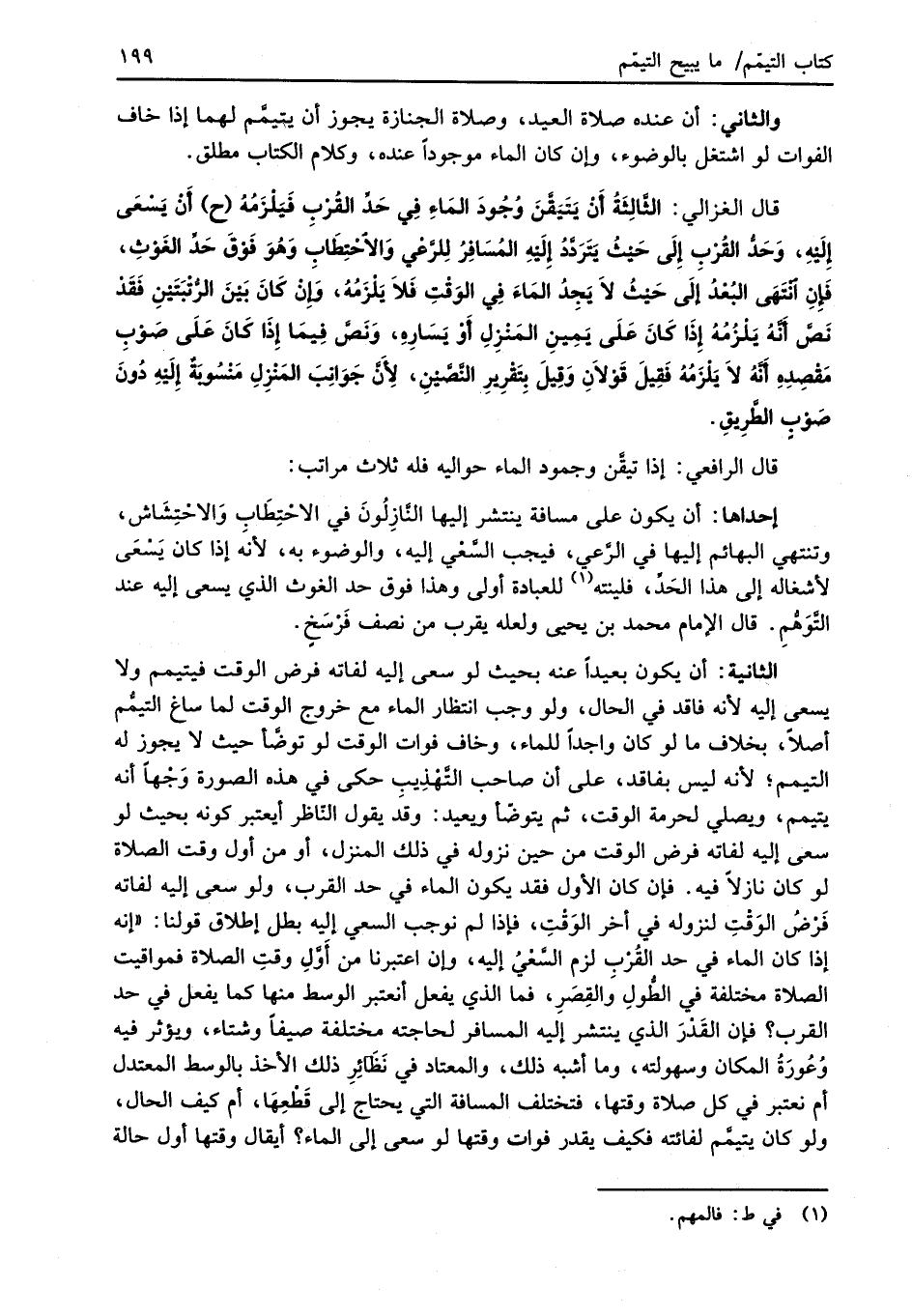 قال الغزالي: الثَّالِثَةُ أَنْ يَتَيقَّنَ وُجُودَ المَاءِ فِي حَدِّ القُرْبِ فَيَلْزَمُهُ (ح) أَنْ يَسْعَى إِلَيْهِ، وَحَدُّ القُرْبِ إِلَى حَيْثُ يَتَرَدَّدُ إِلَيْهِ المُسَافِرُ لِلرَّعْي وَالاَحْتِطَابِ وَهُوَ فَوْقَ حَدِّ الغَوْثِ، فَإِنِ انتَهَى البُعْدُ إلَى حَيْثُ لاَ يَجِدُ المَاءَ فِي الوَقْتِ فَلاَ يَلْزَمُهُ، وإنْ كَانَ بَيْنَ الرُّتبَتَيْنِ فَقَدْ نَصَّ أَنَّهُ يَلْزُمُهُ إِذَا كَانَ عَلَى يَمِينِ المَنْزِلِ أَوْ يَسَارِهِ، وَنَصَّ فِيمَا إِذَا كَانَ عَلَى صَوْبِ مَقْصِدِهِ أنَّهُ لاَ يَلْزَمُهُ فَقِيلَ قَوْلاَنِ وَقِيلَ بِتَقْرِيرِ النَّصَّيْنِ، لِأَنَّ جَوَانِبَ المَنْزِلِ مَنْسُوَبةٌ إِلَيْهِ دُونَ صَوْب الطَّرِيقِ.