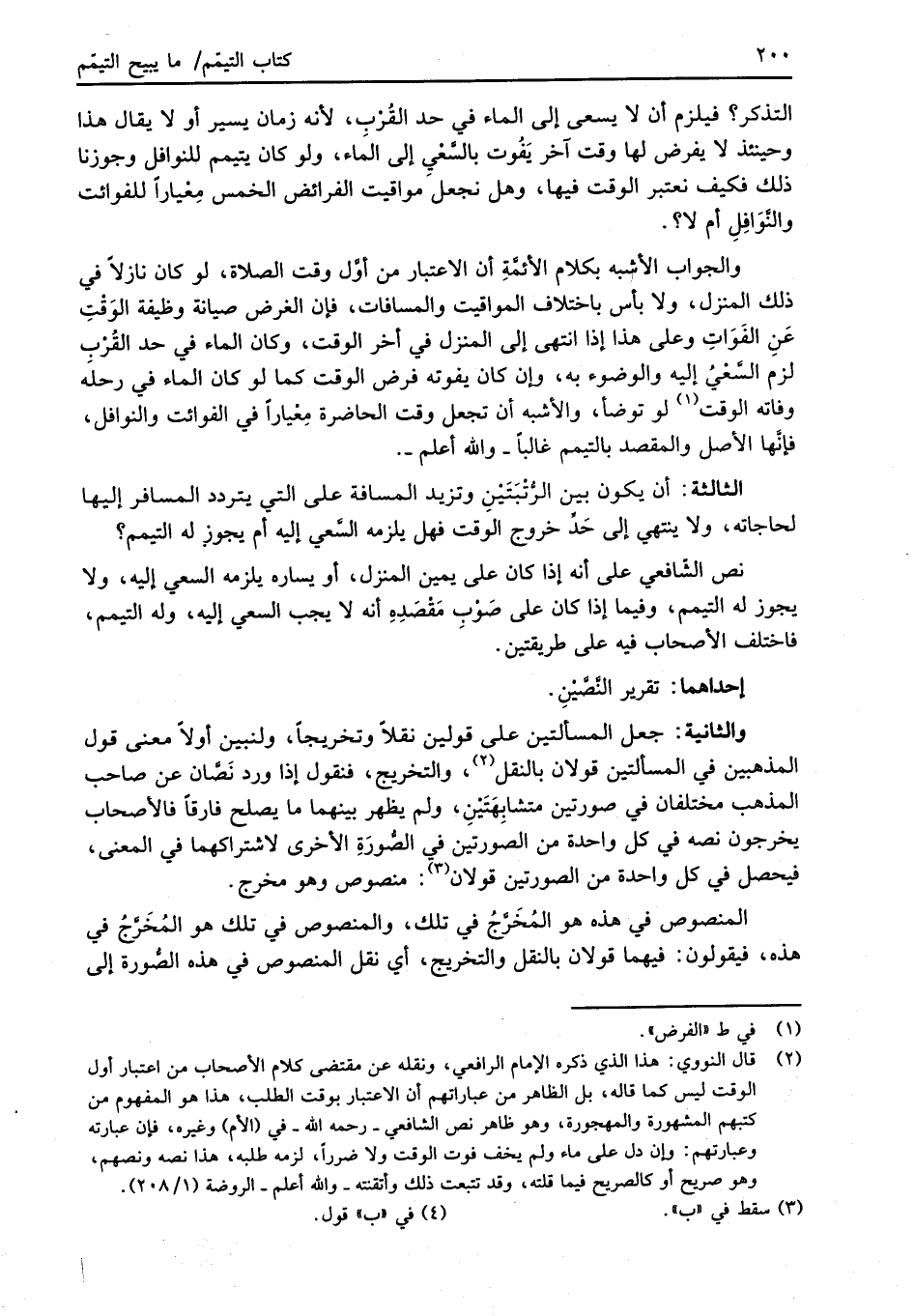 (¬2) قال النووي: هذا الذي ذكره الإمام الرافعي، ونقله عن مقتضى كلام الأصحاب من اعتبار أول الوقت ليس كما قاله، بل الظاهر من عباراتهم أن الاعتبار بوقت الطلب، هذا هو المفهوم من كتبهم المشهورة والمهجورة، وهر ظاهر نص الشافعي -رحمه الله- في (الأم) وغيره، فإن عبارته وعبارتهم: وإن دل على ماء ولم يخف فوت الوقت ولا ضرراً، لزمه طلبه، هذا نصه ونصهم، وهو صريح أو كالصريح فيما قلته، وقد تتبعت ذلك وأتقنته -والله أعلم- الروضة (1/ 208).