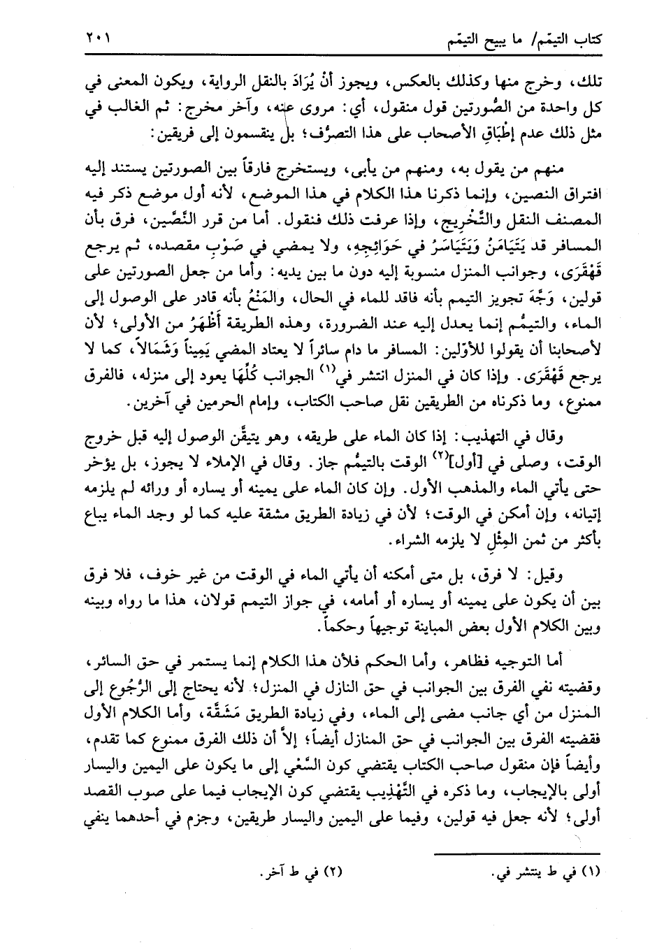منهم من يقول به، ومنهم من يأبى، ويستخرج فارقاً بين الصورتين يستند إليه افتراق النصين، وإنما ذكرنا هذا الكلام في هذا الموضع، لأنه أول موضع ذكر فيه المصنف النقل والتَّخْرِيج، وإذا عرفت ذلك فنقول. أما من قرر النَّصَّين، فرق بأن المسافر قد يَتَيَامَنُ وَيَتَيَاسَرُ في حَوَائِجِهِ، ولا يمضي في صَوْبِ مقصده، ثم يرجع قَهْقَرَى، وجوانب المنزل منسوبة إليه دون ما بين يديه: وأما من جعل الصورتين على قولين، وَجَّهَ تجويز التيمم بأنه فاقد للماء في الحال، والمَنْعُ بأنه قادر على الوصول إلى الماء، والتيمُّم إنما يعدل إليه عند الضرورة، وهذه الطريقة أَظْهَرُ من الأولى؛ لأن لأصحابنا أن يقولوا للأوّلين: المسافر ما دام سائراً لا يعتاد المضي يَمِيناً وَشَمَالاً، كما لا يرجع قَهْقَرَى. وإذا كان في المنزل انتشر في (¬1) الجوانب كُلِّهَا يعود إلى منزله، فالفرق ممنوع، وما ذكرناه من الطريقين نقل صاحب الكتاب، وإمام الحرمين في آخرين.