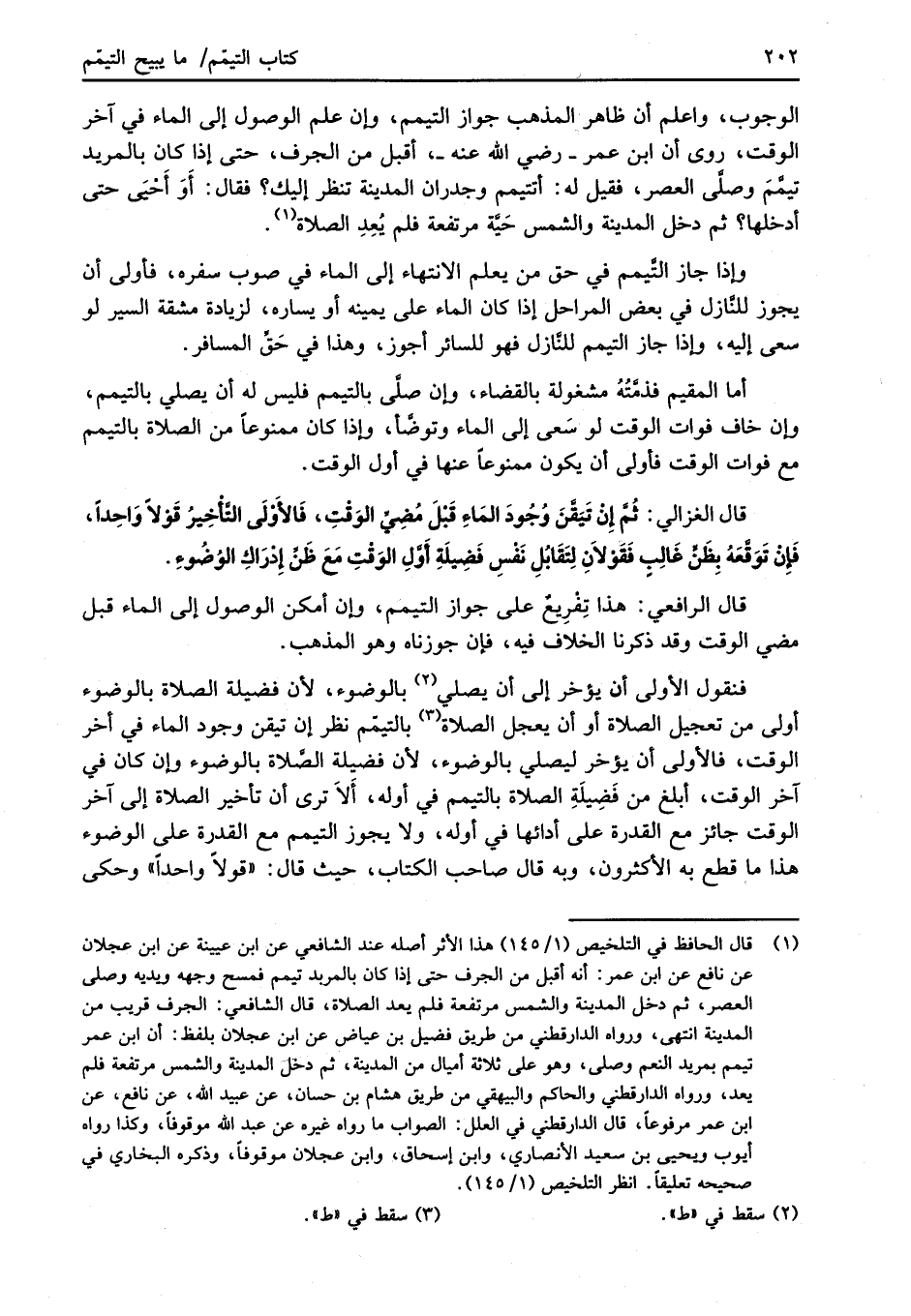 (¬1) قال الحافظ في التلخيص (1/ 145) هذا الأثر أصله عند الشافعي عن ابن عيينة عن ابن عجلان عن نافع عن ابن عمر: أنه أقبل من الجرف حتى إذا كان بالمربد تيمم فمسح وجهه ويديه وصلى العصر، ثم دخل المدينة والشمس مرتفعة فلم يعد الصلاة، قال الشافعي: الجرف قريب من المدينة انتهى، ورواه الدارقطني من طريق فضيل بن عياض عن ابن عجلان بلفظ: أن ابن عمر تيمم بمريد النعم وصلى، وهو على ثلاثة أميال من المدينة، ثم دخل المدينة والشمس مرتفعة فلم يعد، ورواه الدارقطني والحاكم والبيهقي من طريق هشام بن حسان، عن عبيد الله، عن نافع، عن ابن عمر مرفوعاً، قال الدارقطني في العلل: الصواب ما رواه غيره عن عبد الله موقوفاً، وكذا رواه أيوب ويحيى بن سعيد الأنصاري، وابن إسحاق، وابن عجلان موقوفاً، وذكره البخاري في صحيحه تعليقاً. انظر التلخيص (1/ 145).