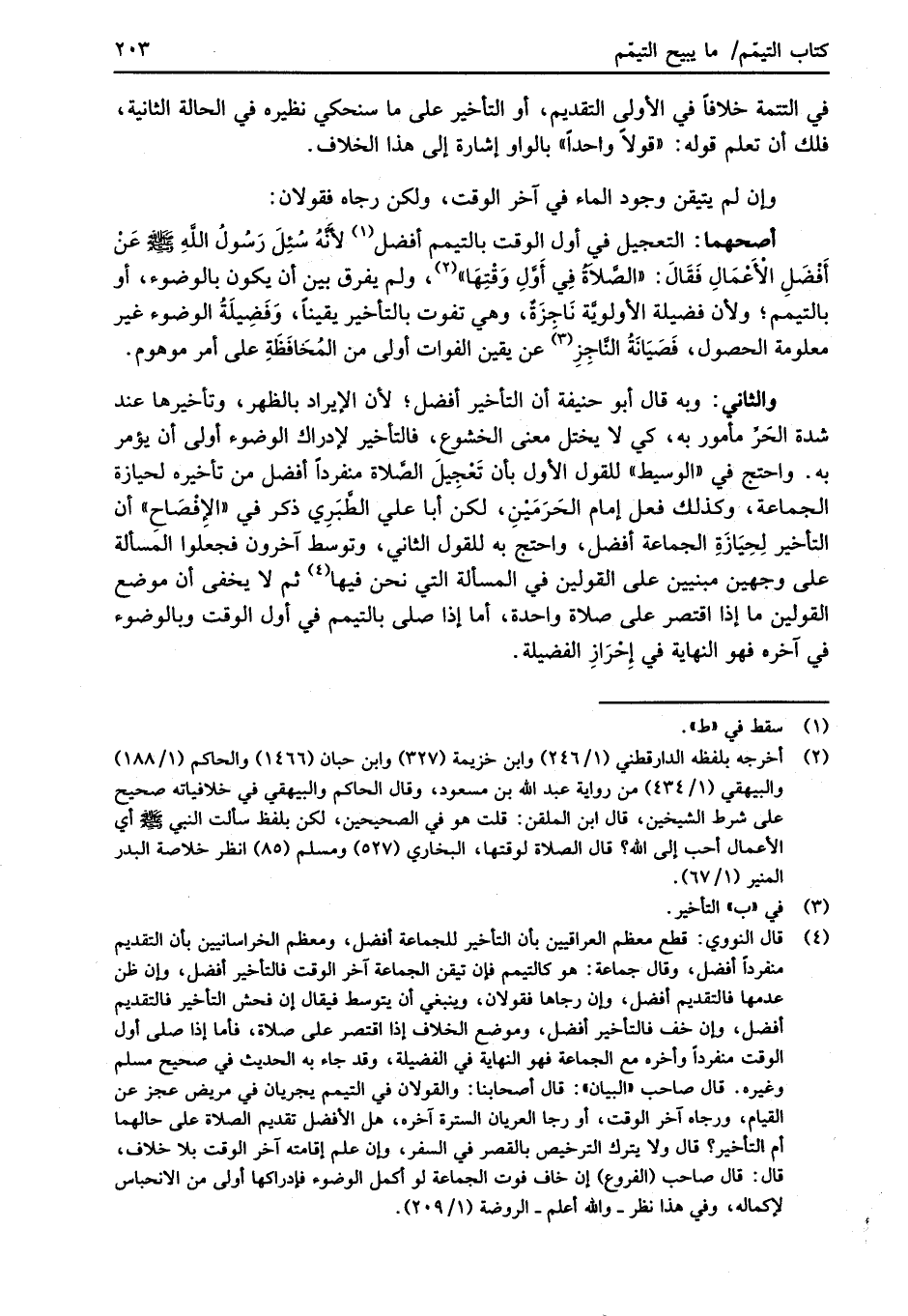 (¬4) قال النووي: قطع معظم العراقيين بأن التأخير للجماعة أفضل، ومعظم الخراسانيين بأن التقديم منفرداً أفضل، وقال جماعة: هو كالتيمم فإن تيقن الجماعة آخر الوقت فالتأخير أفضل، وإن ظن عدمها فالتقديم أفضل، وإن رجاها فقولان، وينبغي أن يتوسط فيقال إن فحش التأخير فالتقديم أفضل، وإن خف فالتأخير أفضل، وموضع الخلاف إذا اقتصر على صلاة، فأما إذا صلى أول الوقت منفرداً وأخره مع الجماعة فهو النهاية في الفضيلة، وقد جاء به الحديث في صحيح مسلم وغيره. قال صاحب "البيان": قال أصحابنا: والقولان في التيمم يجريان في مريض عجز عن القيام، ورجاه آخر الوقت، أو رجا العريان السترة آخره، هل الأفضل تقديم الصلاة على حالهما أم التأخير؟ قال ولا يترك الترخيص بالقصر في السفر، وإن علم إقامته آخر الوقت بلا خلاف، قال: قال صاحب (الفروع) إن خاف فوت الجماعة لو أكمل الوضوء فإدراكها أولى من الانحباس لإكماله، وفي هذا نظر -والله أعلم- الروضة (1/ 209).