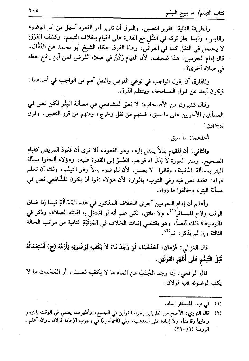 والطريقة الثانية: تقرير النصين، والفرق أن تقرير أمر القعود أسهل من أمر الوضوء واللبس، ولهذا جاز تركه في النَّقْلِ مع القدرة على القيام بخلاف التيمم، وكشف العَوْرَةِ لا يحتمل في النقل كما في الفرض، وهذا الفرق حكاه الشيخ أبو محمد عن القَفَّال، قال إمام الحرمين: هذا ضعيف، لأن القيام رُكْنٌ في صلاة الفرض فمن أين ينفع حطه في صلاة أخرى؟.