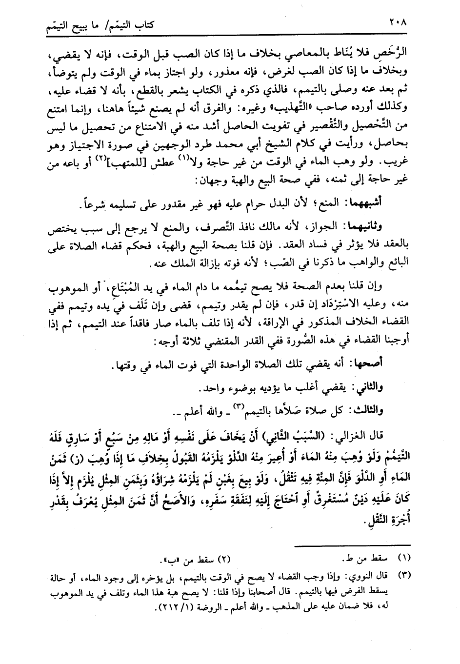 (¬3) قال النووي: وإذا وجب القضاء لا يصح في الوقت بالتيم، بل يؤخره إلى وجود الماء، أو حالة يسقط الفرض فيها بالتيمم. قال أصحابنا وإذا قلنا: لا يصح هبة هذا الماء وتلف في يد الموهوب له، فلا ضمان عليه على المذهب -والله أعلم- الروضة (1/ 212).