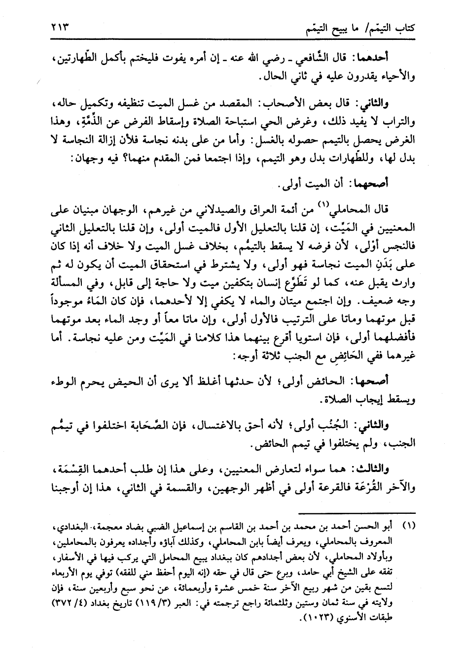 (¬1) أبو الحسن أحمد بن محمد بن أحمد بن القاسم بن إسماعيل الضبي بضاد معجمة،. البغدادي، المعروف بالمحاملي، ويعرف أيضاً بابن المحاملي، وكذلك آباؤه وأجداده يعرفون بالمحاملين، وبأولاد المحاملي، لأن بعض أجدادهم كان ببغداد يبيع المحامل التي يركب فيها في الأسفار، تفقه على الشيخ أبي حامد، وبرع حتى قال في حقه (إنه اليوم أحفظ مني للفقه) توفي يوم الأربعاء لتسع بقين من شهر ربيع الآخر سنة خمس عشرة وأربعمائة، عن نحو سبع وأربعين سنة، فإن ولايته في سنة ثمان وستين وثلثمائة راجع ترجمته في: العبر (3/ 119) تاريخ بغداد (4/ 372) طبقات الأسنوي (1023).