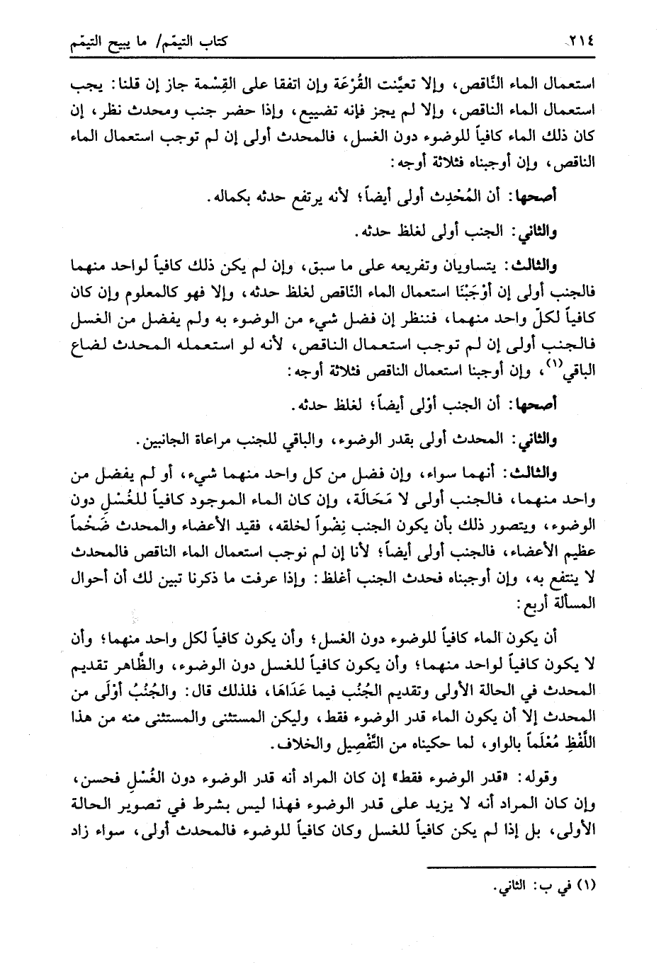أن يكون الماء كافياً للوضوء دون الغسل؛ وأن يكون كافياً لكل واحد منهما؛ وأن لا يكون كافياً لواحد منهما؛ وأن يكون كافياً للغسل دون الوضوء، والظَّاهر تقديم المحدث في الحالة الأولى وتقديم الجُنُب فيما عَدَاهَا، فلذلك قال: والجُنُبُ أوْلَى من المحدث إلا أن يكون الماء قدر الوضوء فقط، وليكن المستثنى والمستثنى منه من هذا اللفظِ مُعْلَماً بالواو، لما حكيناه من التَّفْصِيل والخلاف.