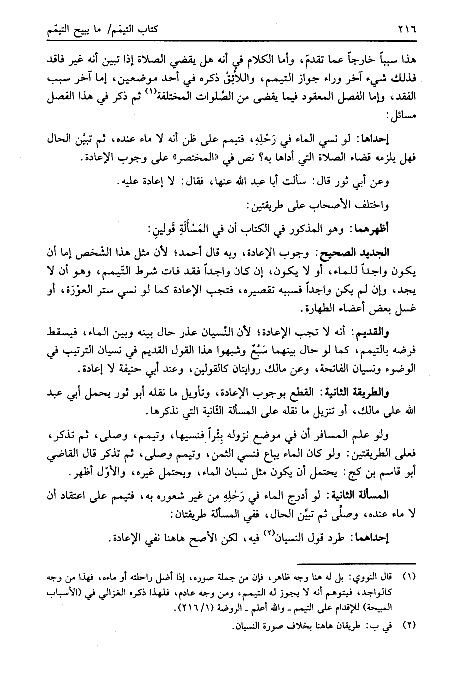 (¬1) قال النووي: بل له هنا وجه ظاهر، فإن من جملة صوره، إذا أضل راحلته أو ماءه، فهذا من وجه كالواجد، فيتوهم أنه لا يجوز له التيمم، ومن وجه عادم، فلهذا ذكره الغزالي في (الأسباب المبيحة) للإقدام على التيمم -والله أعلم- الروضة (1/ 216).