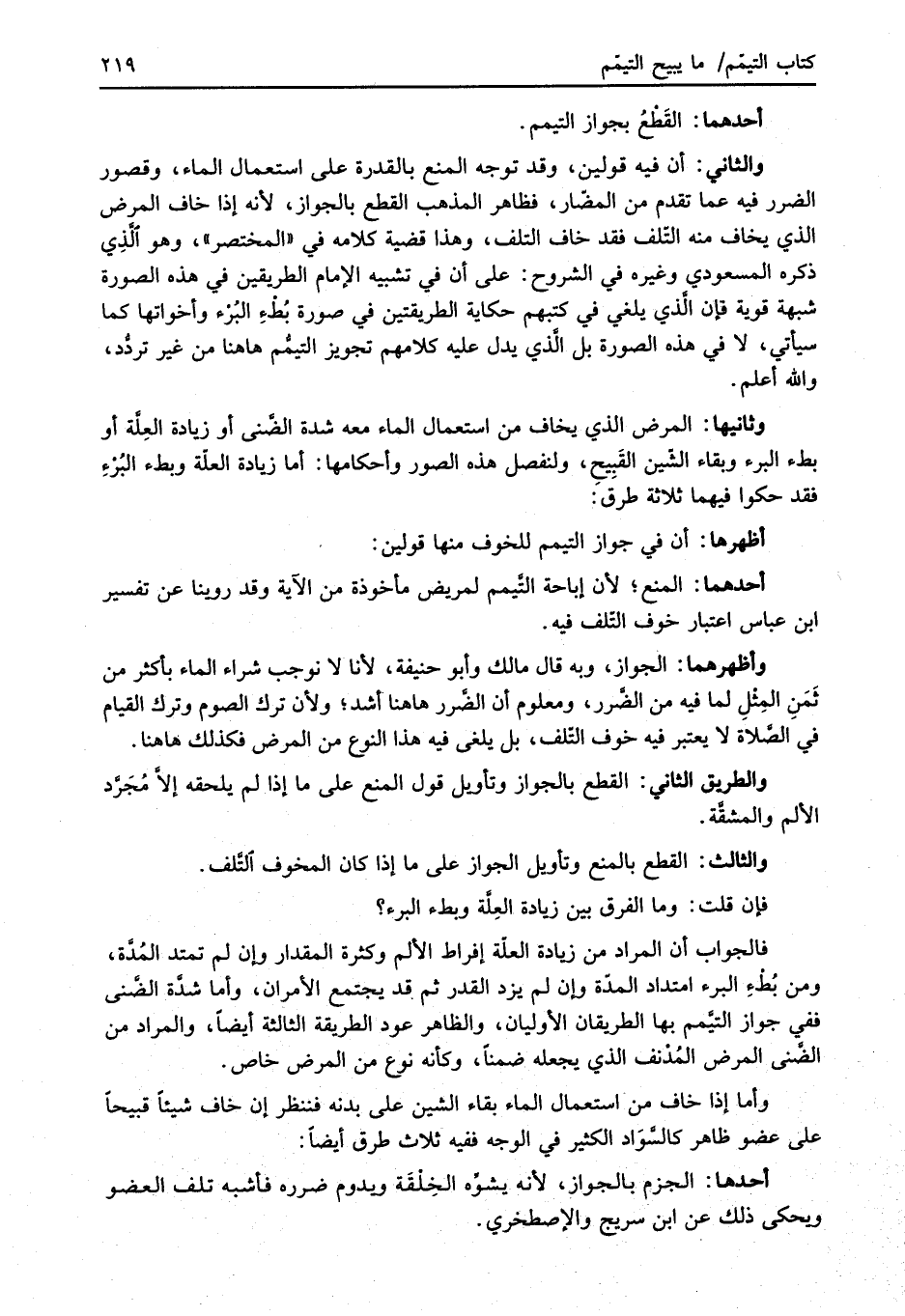 وثانيها: المرض الذي يخاف من استعمال الماء معه شدة الضَّنى أو زيادة العِلَّة أو بطء البرء وبقاء الشّين القَبِيحِ، ولنفصل هذه الصور وأحكامها: أما زيادة العلّة وبطء البُرْءِ فقد حكوا فيهما ثلاثة طرق: