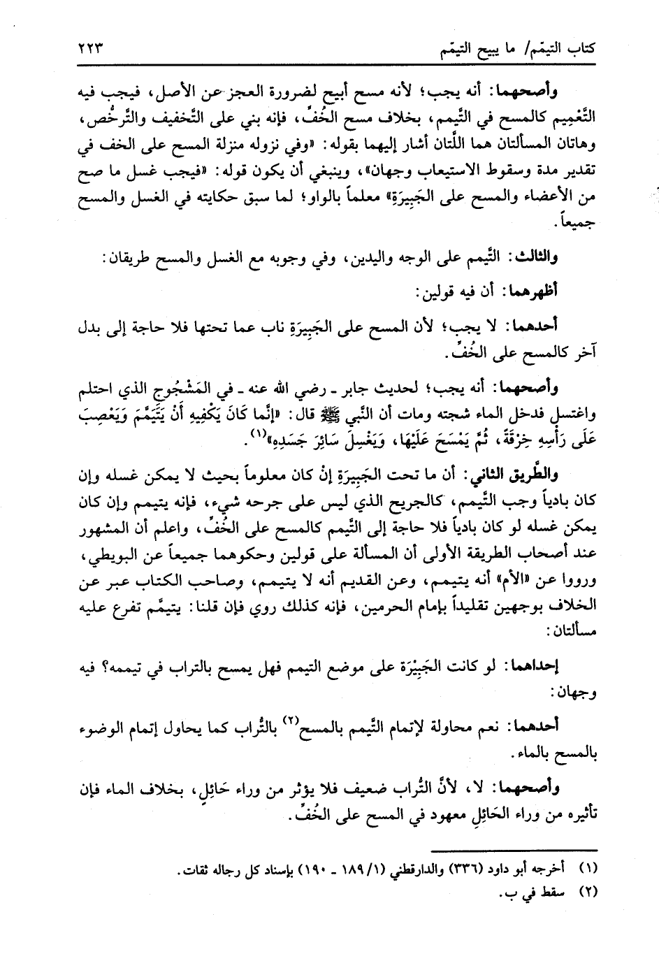 والطَّريق الثاني: أن ما تحت الجَبِيرَةِ إنْ كان معلوماً بحيث لا يمكن غسله وإن كان بادياً وجب التَّيمم، كالجريح الذي ليس على جرحه شيء، فإنه يتيمم وإن كان يمكن غسله لو كان بادياً فلا حاجة إلى التَّيمم كالمسح على الخُفِّ، واعلم أن المشهور عند أصحاب الطريقة الأولى أن المسألة على قولين وحكوهما جميعاً عن البويطي، ورووا عن "الأم" أنه يتيمم، وعن القديم أنه لا يتيمم، وصاحب الكتاب عبر عن الخلاف بوجهين تقليداً بإمام الحرمين، فإنه كذلك روي فإن قلنا: يتيمَّم تفرع عليه مسألتان: