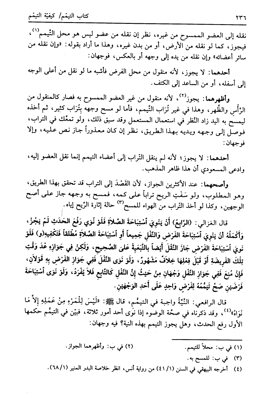 قال الغزالي: (الرَّابعُ) أَنْ يَنْوِيَ اسْتِبَاحَةَ الصَّلاَةِ فَلَوْ نُوَي رَفْعَ الحَدَثِ لَمْ يَجُزْ، وَأَكْمَلُهُ أنْ يَنْوِيَ استِبَاحَةَ الفَرْضِ وَالنَّفْلِ جَمِيعًا أَوِ اسْتِبَاحَةَ الصَّلاَةِ مُطْلقًا فَتَكْفِيهِ (و) فَلَوْ نَويَ اسْتِبَاحَةَ الفَرْضِ جَازَ النَّقْلَ أَيضًا بالتَّبَعَيِة عَلىَ الصَّحِيحِ، وَلَكِنْ فِي جَوَازِهِ عدَ وَقْتِ تِلْكَ الفَرِيضَةِ أَوْ قَبْلَ فِعْلِهَا خِلاَفٌ مَشْهُورٌ، وَلَوْ نَوَى النَّفْلَ فَفِي جَوَازِ الفَرْضِ بِهِ قَوْلاَنِ، فَإِنْ مُنِعَ فَفِي جَوَازِ النَّفْلِ وَجْهَانِ مِنْ حَيْثُ إِنَّ النَّفْلِ كَالتَّابعِ فَلاَ يُفْرَدُ، وَلَوْ نَوَى اسْتِبَاحَةَ فَرْضَيْنِ صَحَّ تَيَمُّمُهُ لِفَرْضِ وَاحِدٍ عَلَى أَحَدِ الوَجْهَيْنِ.