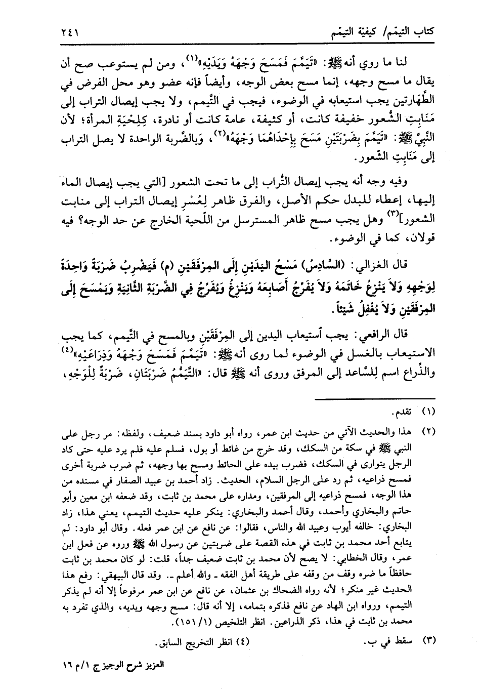 (¬2) هذا والحديث الآتي من حديث ابن عمر، رواه أبو داود بسند ضعيف، ولفظه: مر رجل على النبي -صلى الله عليه وسلم- في سكة من السكك، وقد خرج من غائط أو بول، فسلم عليه فلم يرد عليه حتى كاد الرجل يتوارى في السكك، فضرب بيده على الحائط ومسح بها وجهه، ثم ضرب ضربة أخرى فمسح ذراعيه، ثم رد على الرجل السلام، الحديث. زاد أحمد بن عبيد الصفار في مسنده من هذا الوجه، فمسح ذراعيه إلى المرفقين، ومداره على محمد بن ثابت، وقد ضعفه ابن معين وأبو حاتم والبخاري وأحمد، وقال أحمد والبخاري: ينكر عليه حديث التيمم، يعني هذا، زاد البخاري: خالفه أيوب وعبيد الله والناس، فقالوا: عن نافع عن ابن عمر فعله. وقال أبو داود: لم يتابع أحد محمد بن ثابت في هذه القصة على ضربتين عن رسول الله -صلى الله عليه وسلم- وروه عن فعل ابن عمر، وقال الخطابي: لا يصح لأن محمد بن ثابت ضعيف جداً، قلت: لو كان محمد بن ثابت حافظاً ما ضره وقف من وقفه على طريقة أهل الفقه -والله أعلم-. وقد قال البيهقي: رفع هذا الحديث غير منكر؛ لأنه رواه الضحاك بن عثمان، عن نافع عن ابن عمر مرفوعاً إلا أنه لم يذكر التّيمم، ورواه ابن الهاد عن نافع فذكره بتمامه، إلا أنه قال: مسح وجهه ويديه، والذي تفرد به محمد بن ثابت في هذا، ذكر الذراعين. انظر التلخيص (1/ 151).